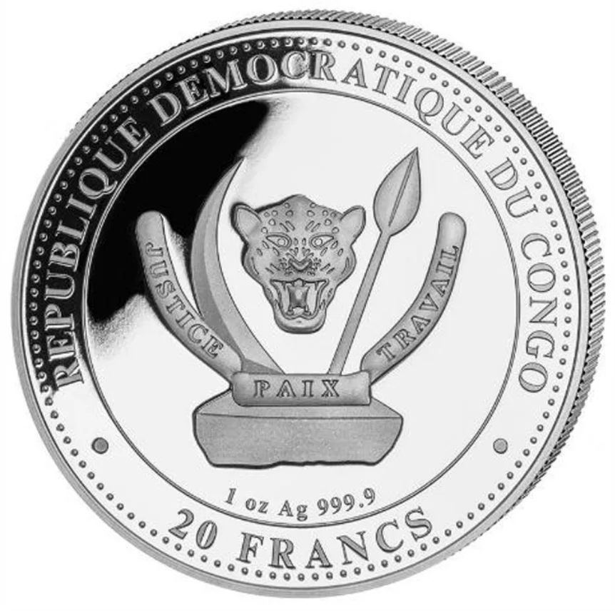 Awers zdobi herb Republiki Konga wraz z informacjami o nominale, wadze i próbie srebra.
