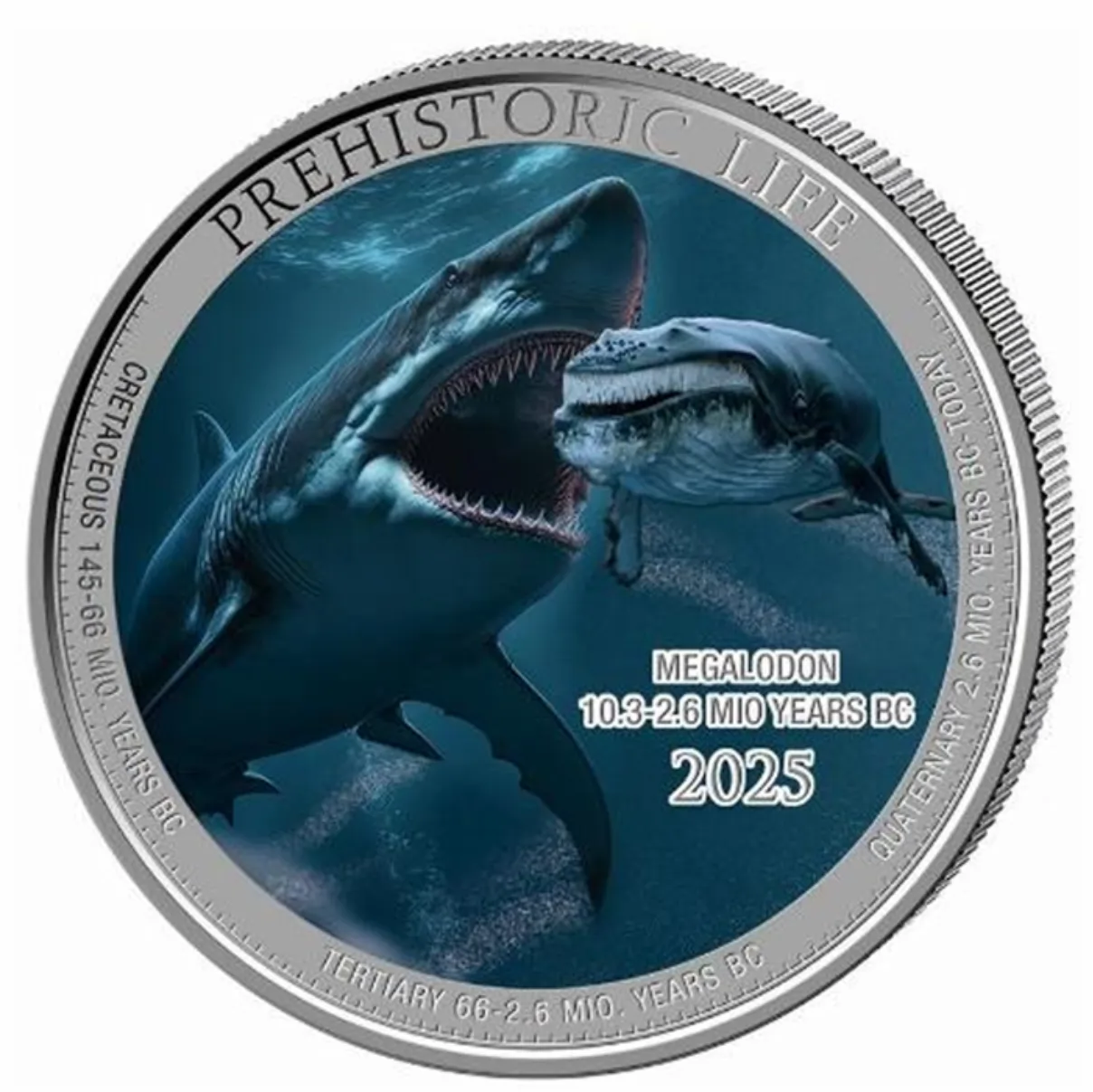 Srebrna moneta Megalodon Prehistoric Life 1 uncja srebra 2025 Kolorowany