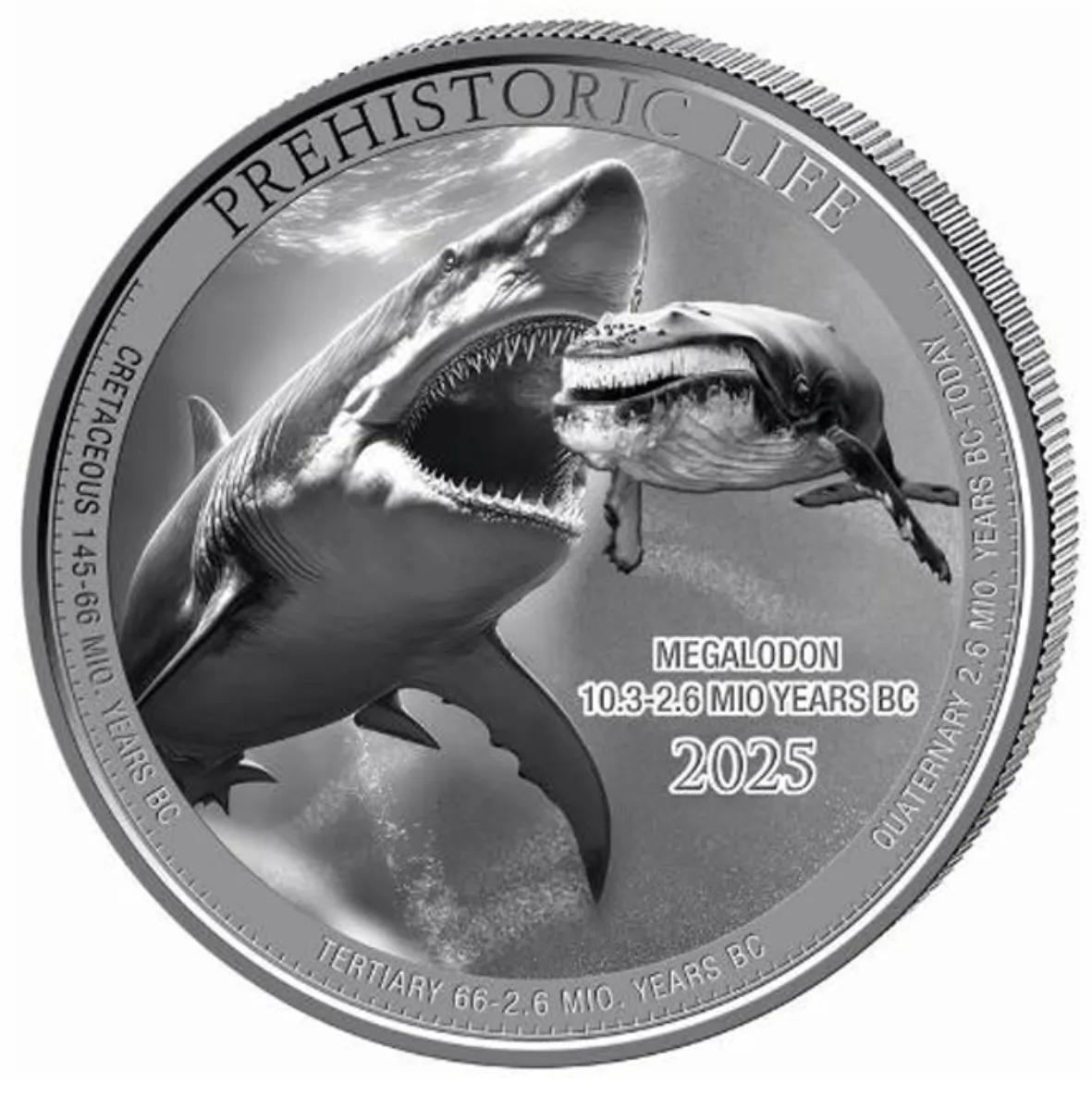 Megalodon został wybity ze srebra najwyższej próby. Moneta o wadze 1 uncji posiada kolorowy nadruk, który ożywia postać pradawnego drapieżnika i nadaje monecie unikalny, artystyczny wymiar.