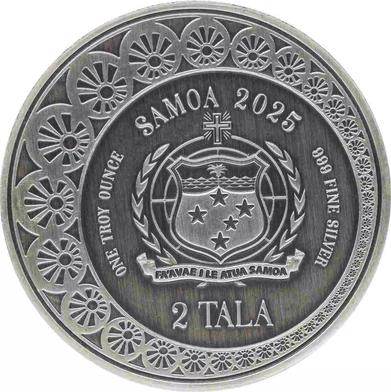 Awers zdobi oficjalny herb Samoa, potwierdzając jego autentyczność i status jako prawny środek płatniczy wspierany przez rząd.