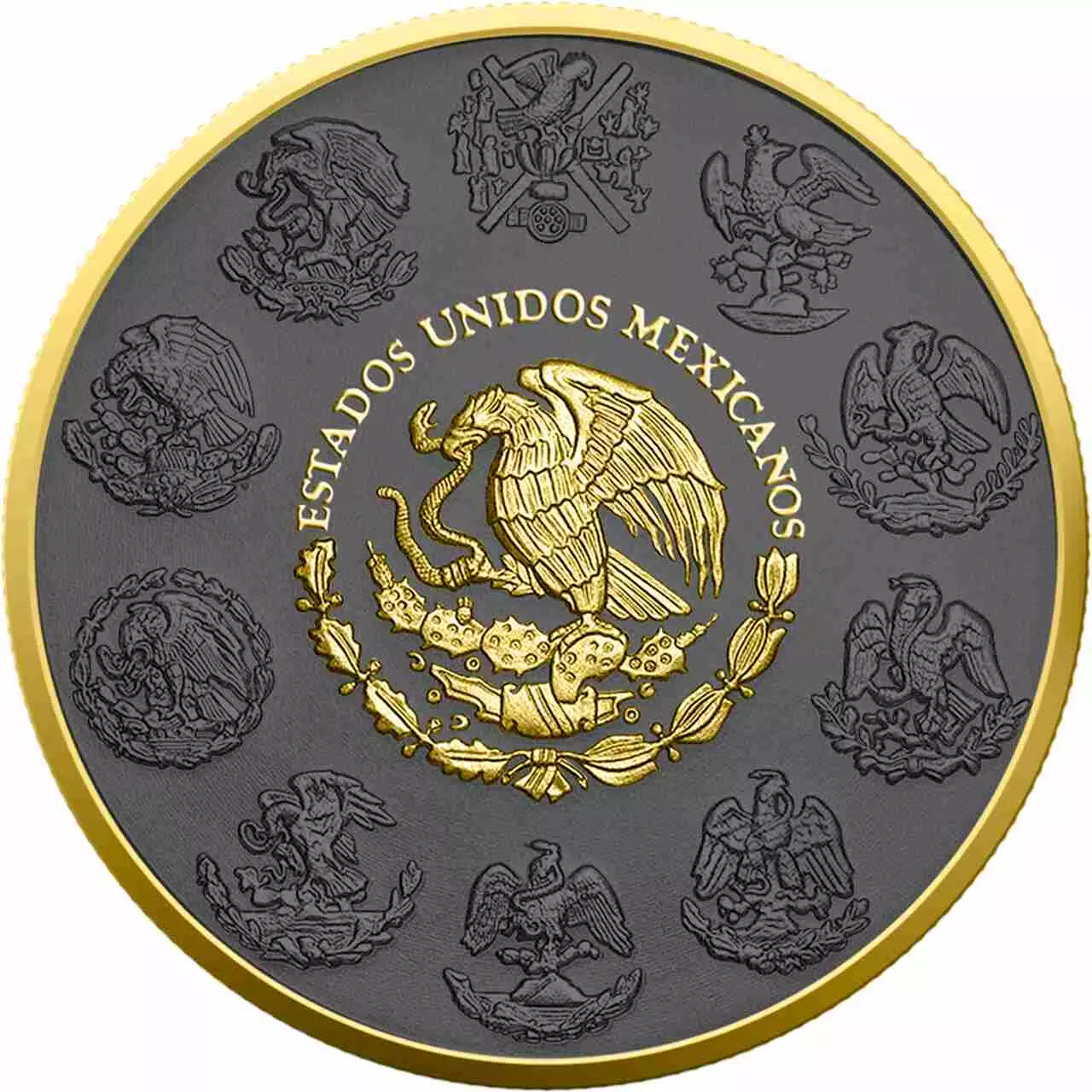 Awers ukazuje pozłocony wizerunek orła trzymającego w paszczy węża. Wokół herbu widnieją mniejsze wersje historycznych herbów Meksyku.