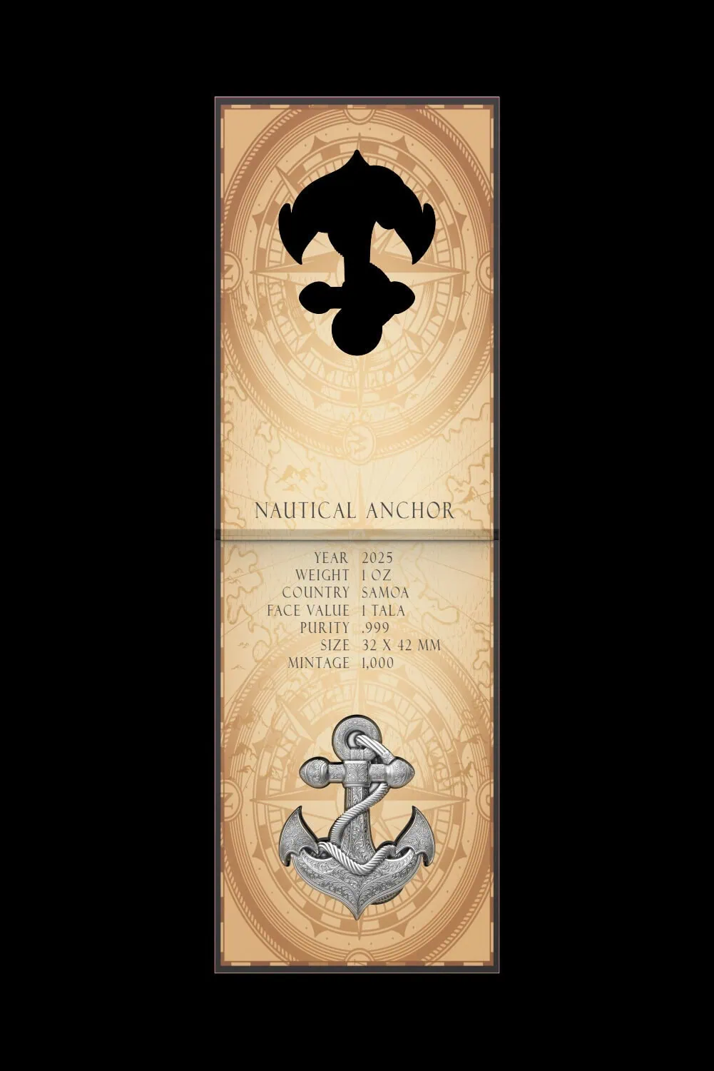 Nautical Anchor to srebrna moneta próby 999 o wadze 1 uncji srebra wybita w antycznym wysokim reliefie o kształcie kotwicy. Antyczne wykończenie powierzchni podkreśla teksturę, podczas gdy wysoki relief nadaje głębi i realizmu. Dzięki temu moneta sprawia wrażenie autentycznego artefaktu z historii morskiej, wykonanego z nowoczesną precyzją mennicy.