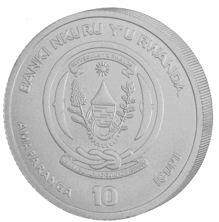Na awersie widnieje herb narodowy Rwandy, kraju emitenta, wraz z nominałem 10 franków rwandyjskich. Elementy te potwierdzają status monety jako pełnoprawnego środka płatniczego. Klasyczna kompozycja awersu kontrastuje z bogatym rewersem, nadając całości elegancki i uporządkowany wygląd.
