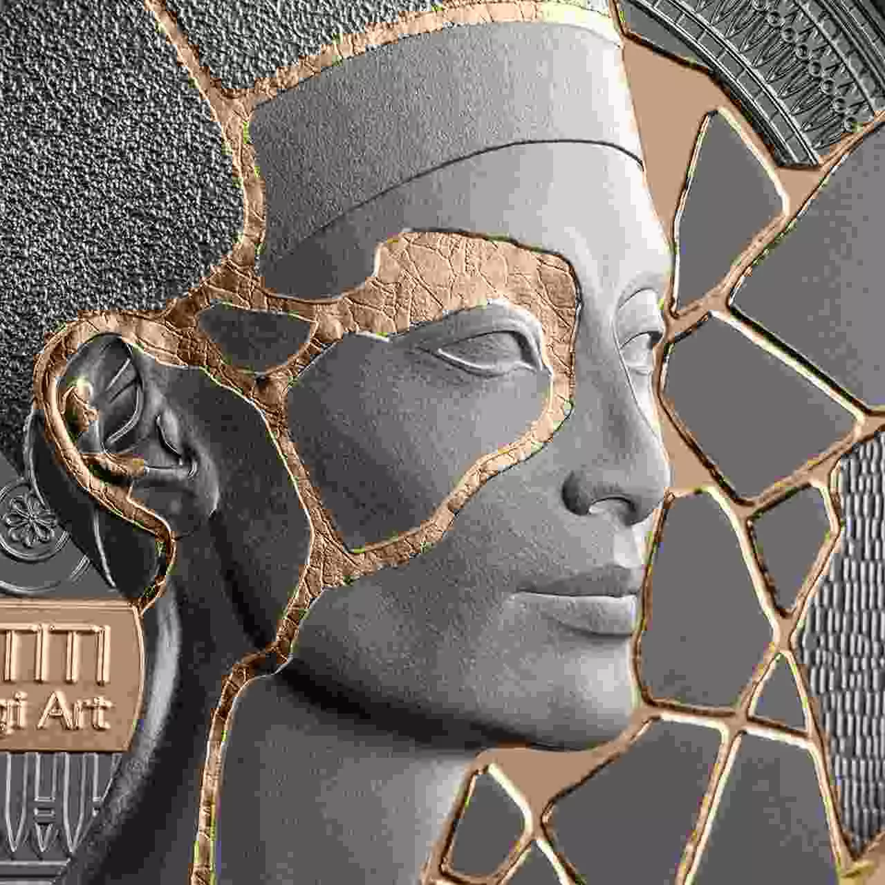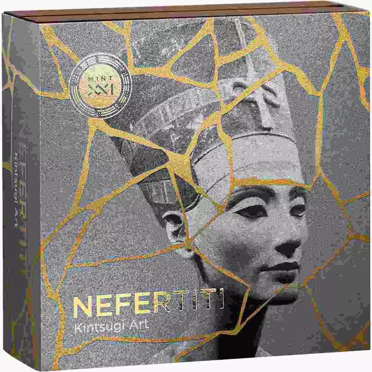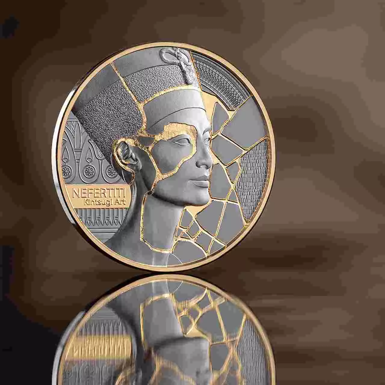Nefertiti została wybita ze srebra najwyższej próby w jakości high relief z głęboką powierzchnią z rutenu oraz selektywnym złoceniu. Moneta wyróżnia się unikalnym projektem inspirowanym japońską techniką kintsugi, w której pęknięcia nie są ukrywane, lecz podkreślane i uszlachetniane.
