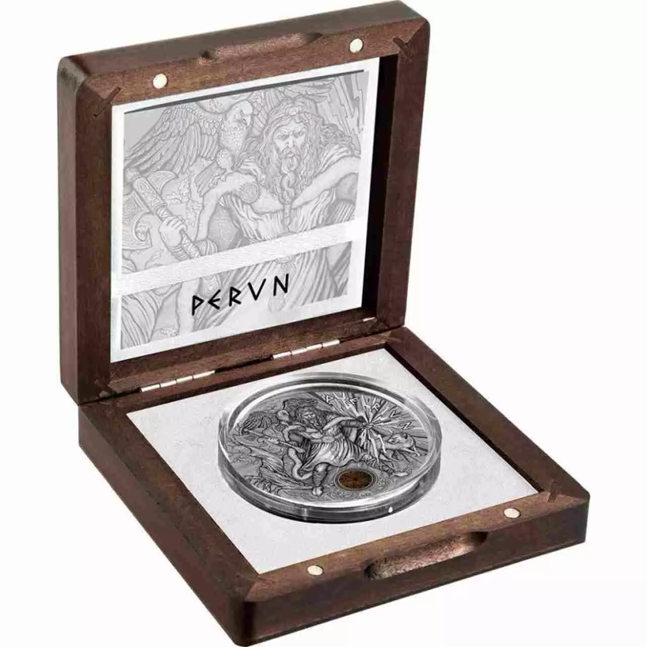 Perun Thunder został wybity ze srebra najwyższej próby i waży dwie uncje trojańskie. Waga dwóch uncji umożliwiła tworzenie rozbudowanego projektu z wyraźnie zaznaczonymi detalami. Wysoki relief podkreśla dramatyzm sceny i potęgę przedstawionej postaci. Dwuncjowe monety zyskują na popularności wśród kolekcjonerów dzięki efektownemu wyglądowi oraz większej zawartości kruszcu w jednym walorze.