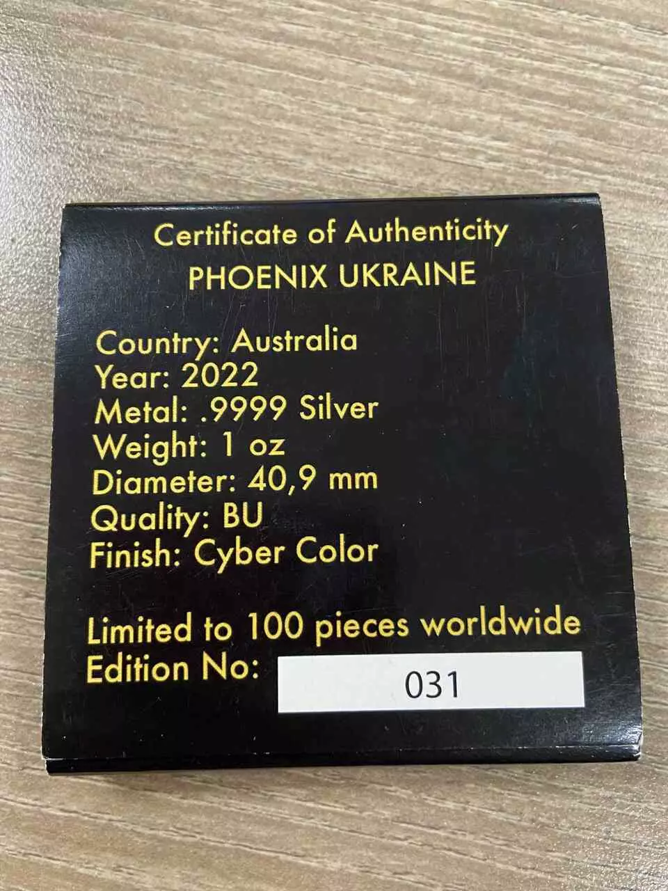 Phoenix Ukraine został wybity ze srebra najwyższej próby i waży jedną uncję. Moneta została wykończona w technologii PowerChrome, która nadaje monecie żywych kolorów oraz efektu głębi, tworząc spektakularny wygląd monety, która przyciąga wzrok. Całość tworzy nowoczesną, emocjonalną kompozycję o silnym przekazie symbolicznym.