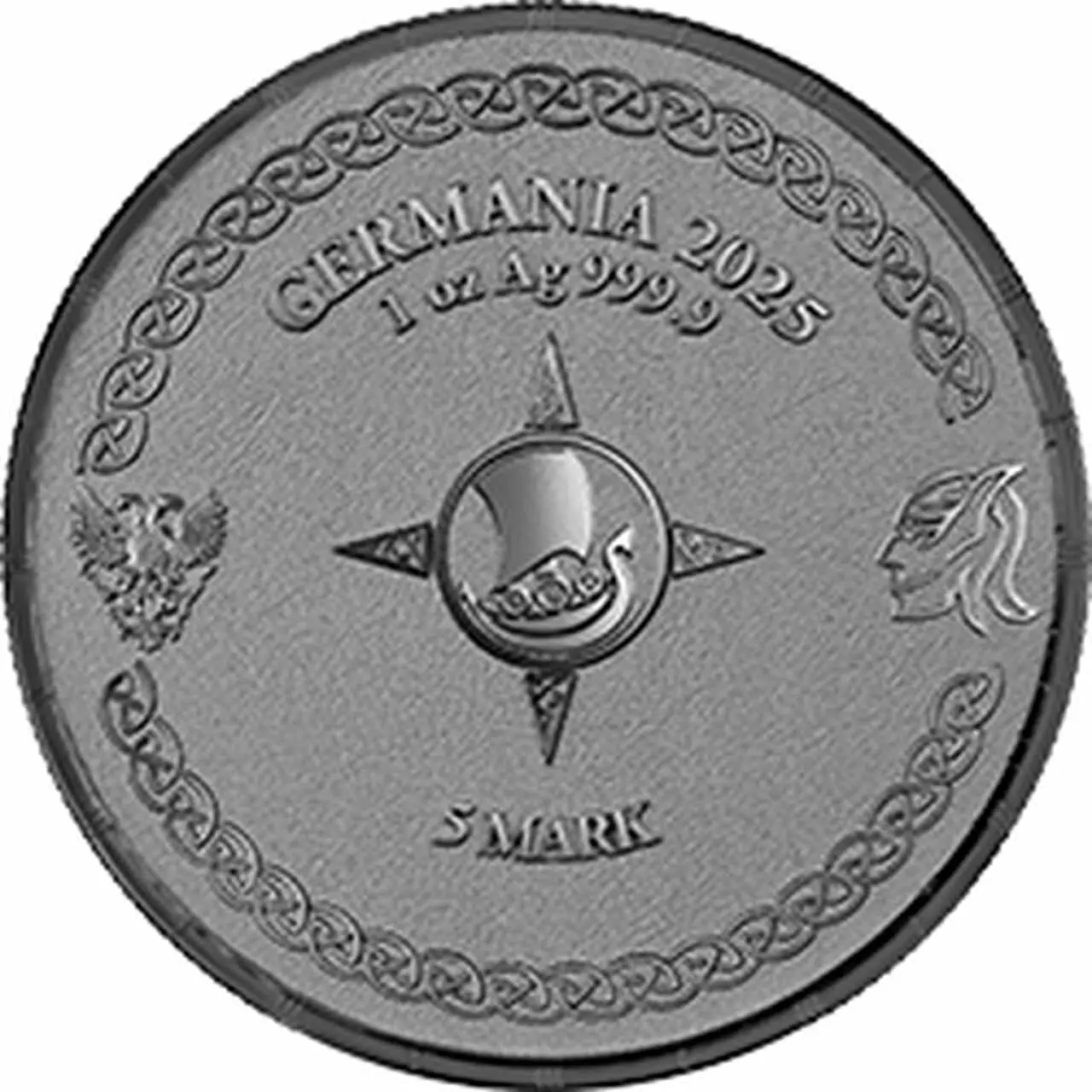 Awers reprezentuje wizerunek łodzi oraz herb Germania Mint.