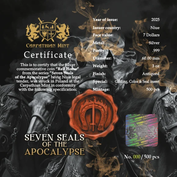Red Horse to druga odsłona monety z serii Seven Seals of the Apocalypse. Cała seria cieszy się sporym zainteresowaniem na rynku metali szlachetnych i ukazuje motywy związane z Apokalipsą oraz czterema jeźdźcami, które znajdują w Księdze Objawienia w Biblii. Moneta to doskonała propozycja dla kolekcjonerów i inwestorów, którzy poszukają monet o wysokiej wartości inwestycyjnej oraz bogatej symbolice religijnej. Dzięki wysokiej próbie srebra, ograniczonemu nakładowi oraz wyjątkowemu motywowi, moneta ta stanowi cenną inwestycję i wspaniały element kolekcji.