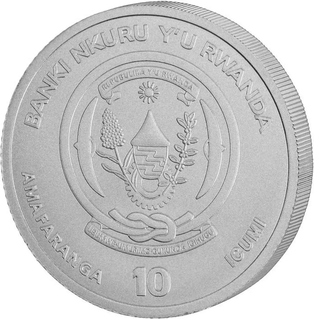 Awers ukazuje herb Rwandy wraz z nominałem monety.