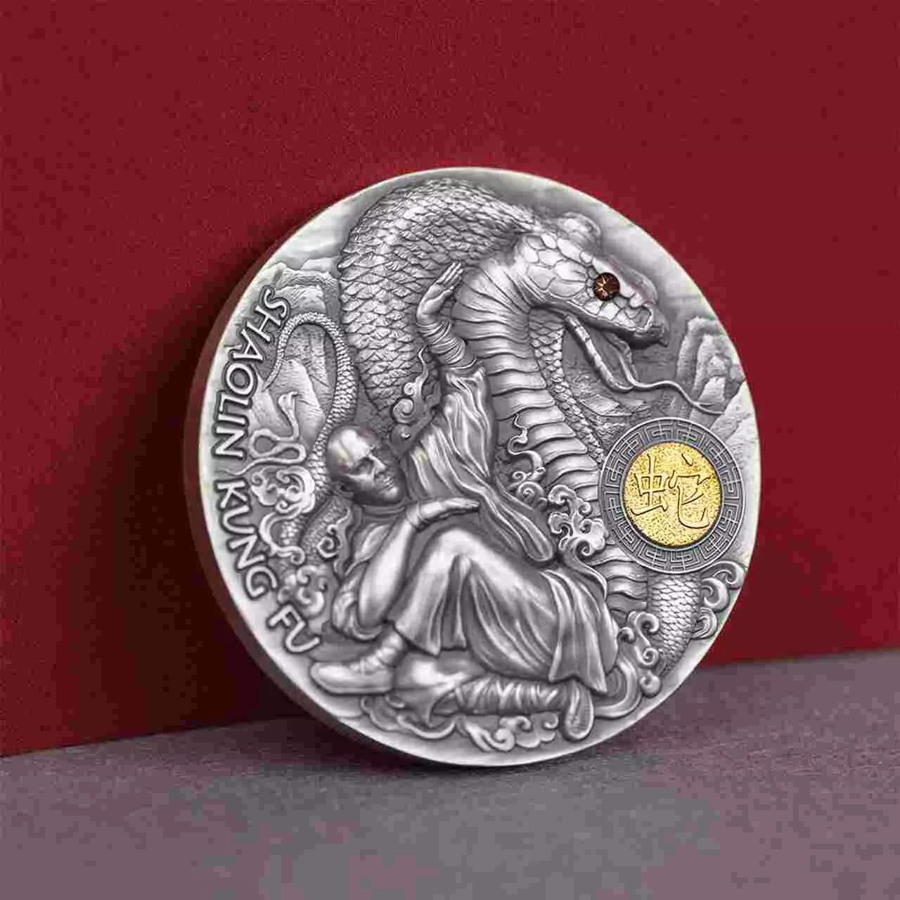 Shaolin Kung Fu Snake został wybity z dwóch uncji srebra najwyższej próby w jakości high relief, co nadało monecie wyjątkowego wyglądu. Walor posiada antyczne wykończenie oraz został ozdobiony kryształem Swarovskiego i selektywnym złoceniem.