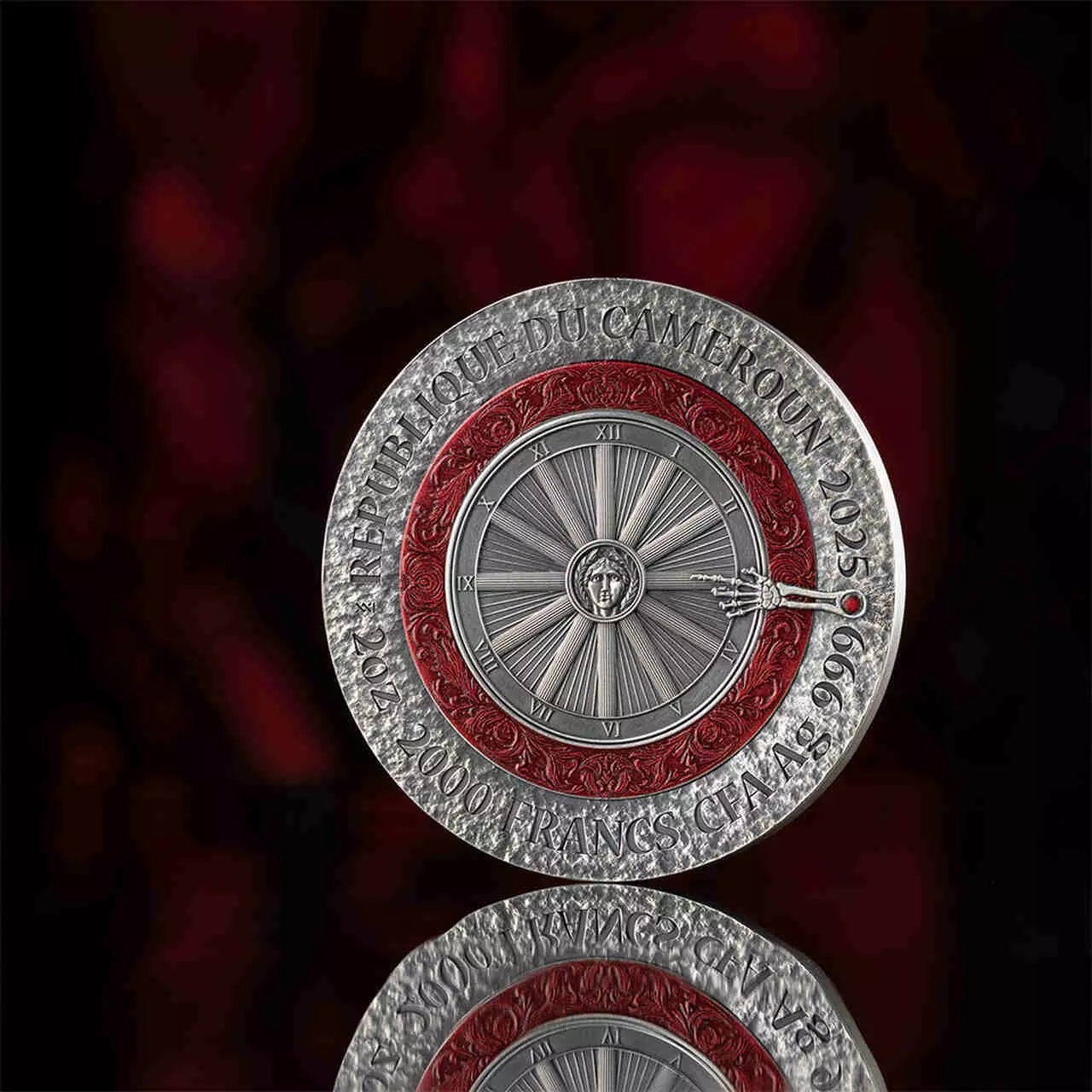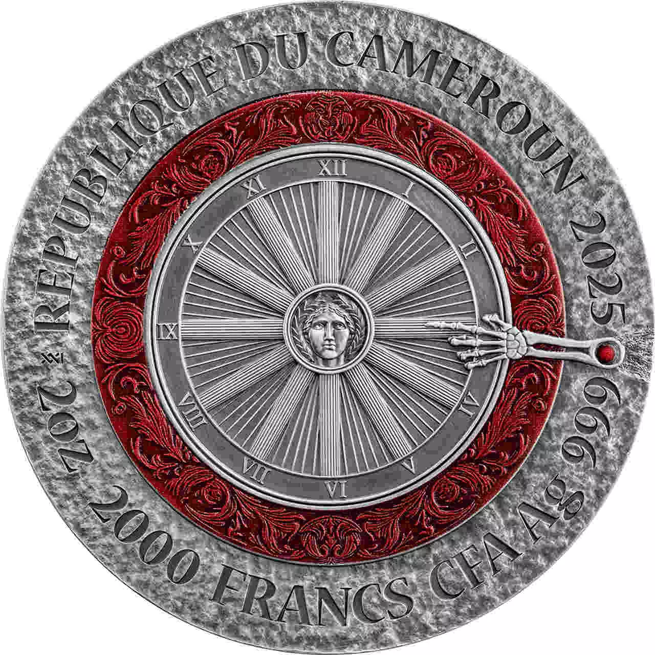 Awers przedstawia twarz rzymskiego cesarza na tle antycznego tarczy zegara. Szkielet ręki wskazuje godzinę 3.
