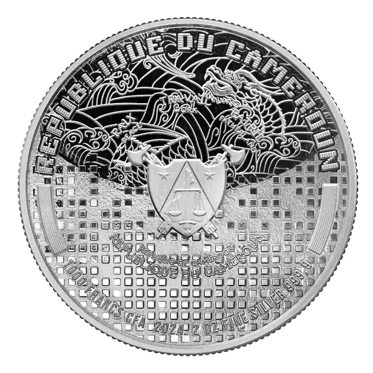 Awers ukazuje herb Republiki Kamerunu. Nad nim przedstawiono smoka za pomocą dynamicznych linii, a po nim geometryczny wzór złożony z kwadratowych pikseli.