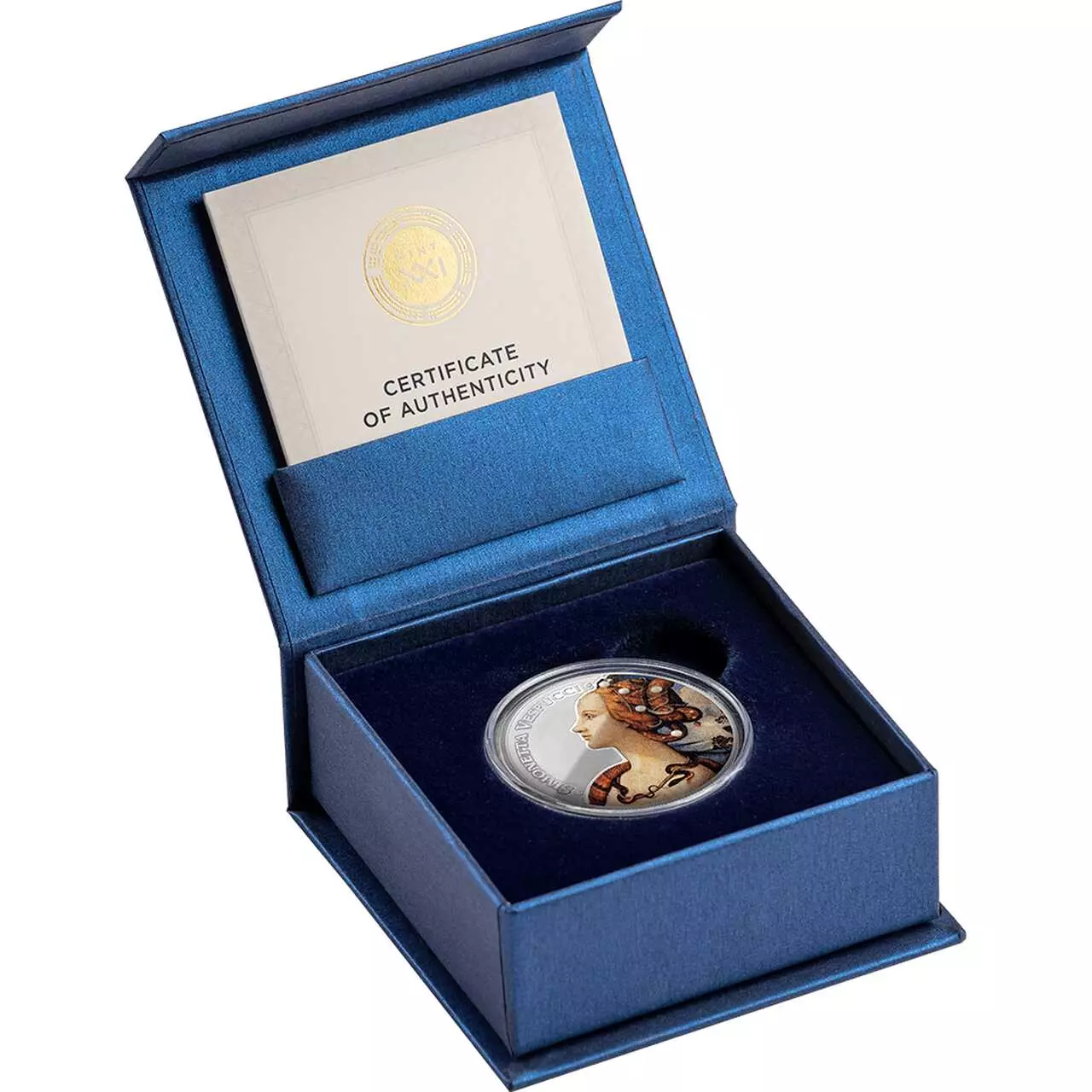 Simonetta Vespucci to srebrny walor próby 999 o wadze 1/2 uncji. Moneta posiada kolorowy nadruk oraz wstawkę z metali szlachetnych.