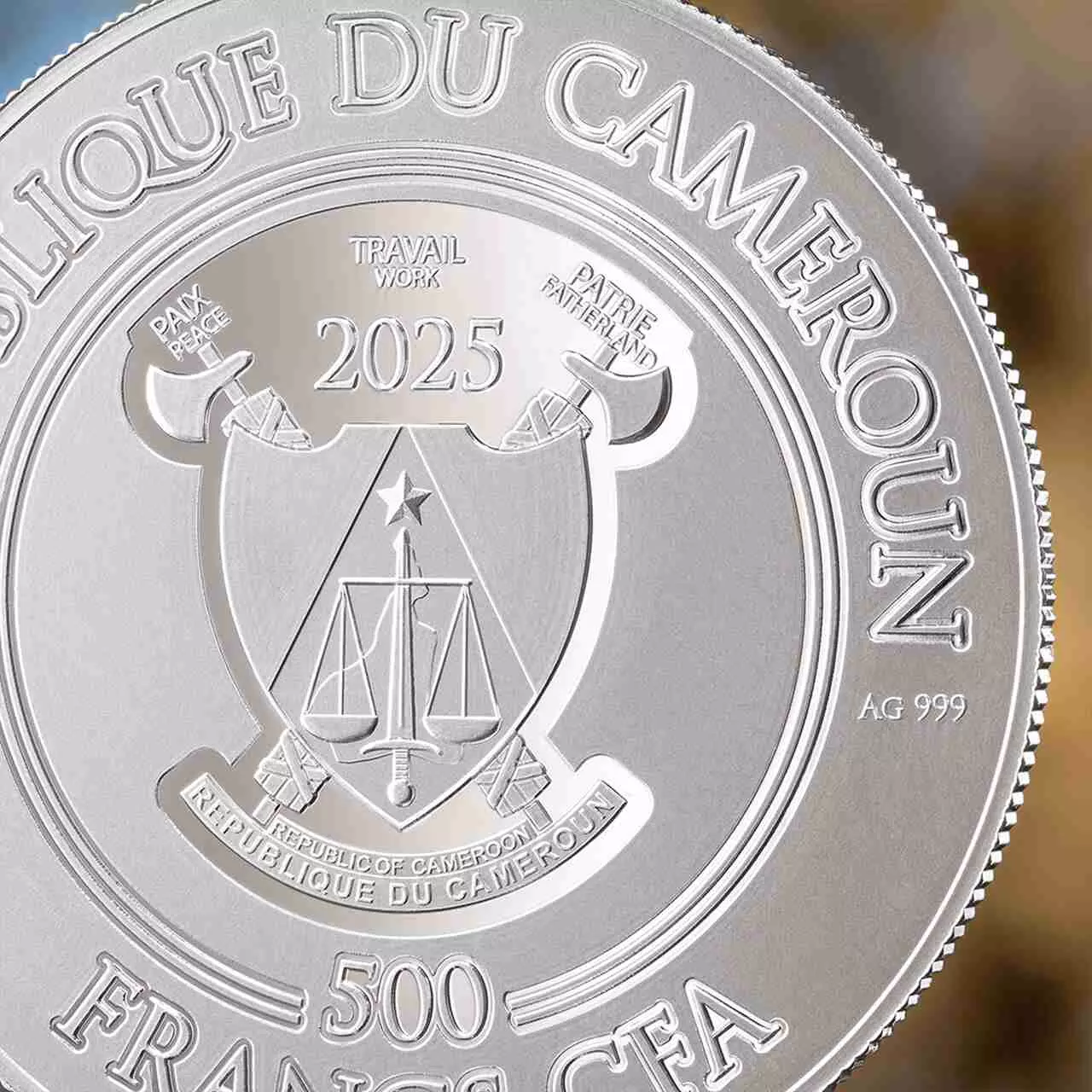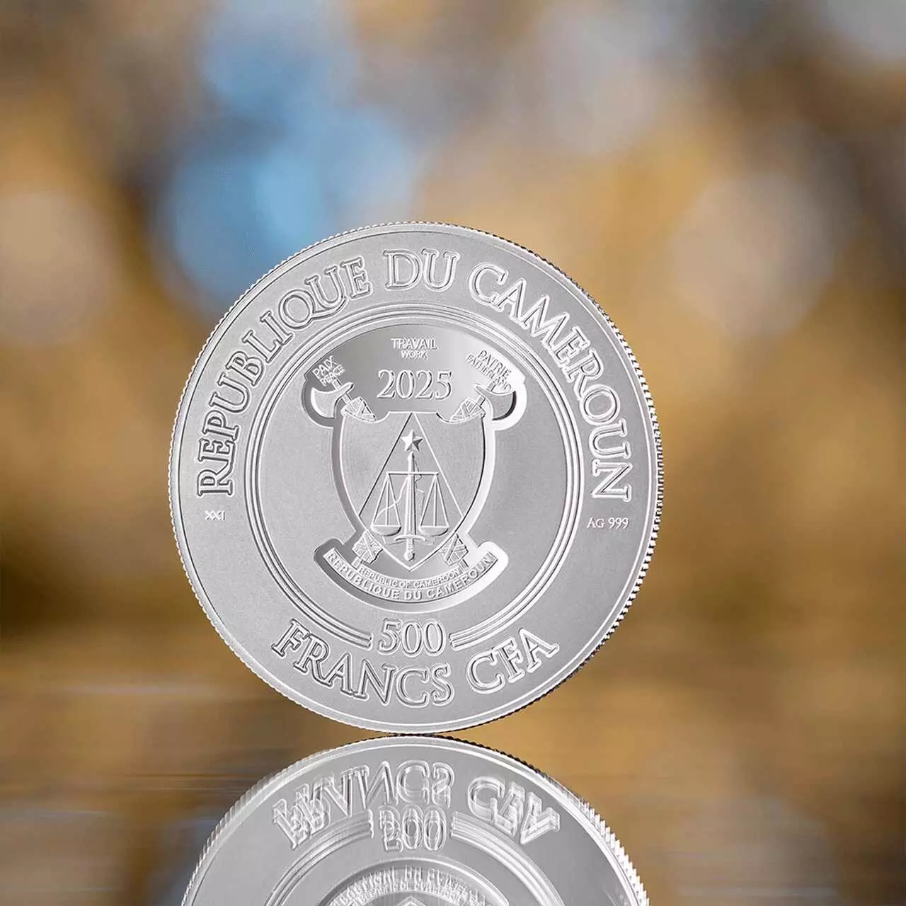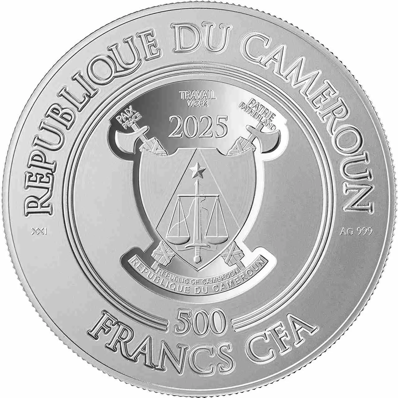 Awers ukazuje herb Kamerunu.