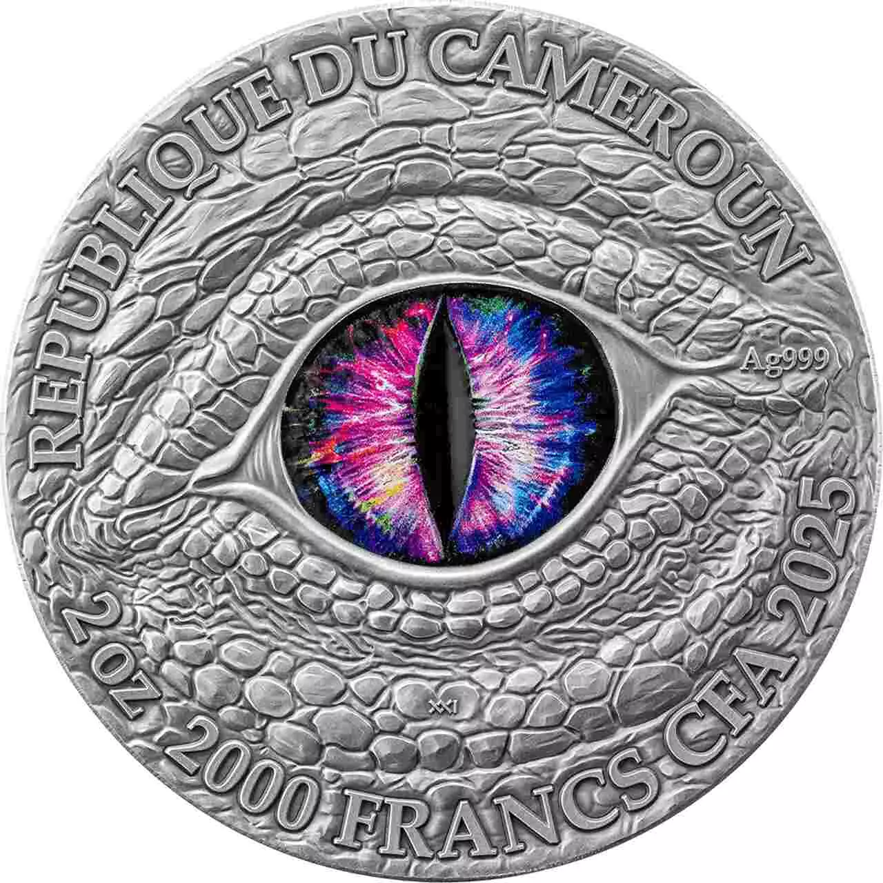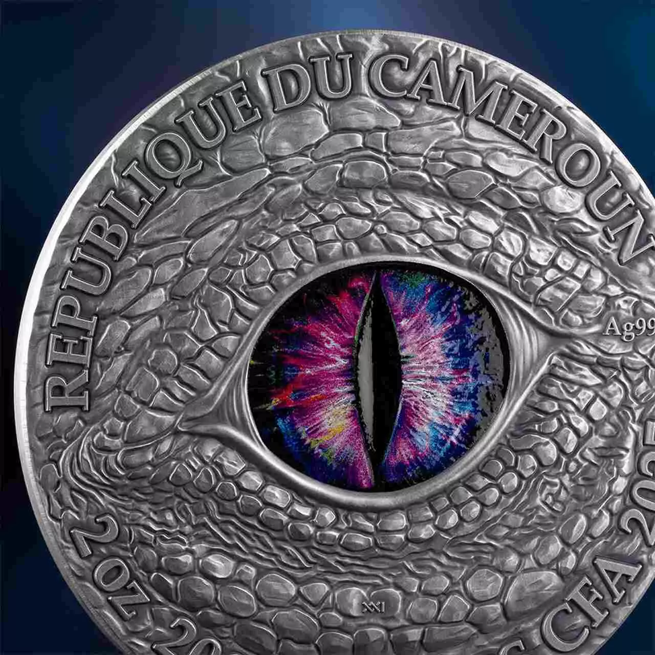 Awers przedstawia ogromne, tęczowe, smocze oko.