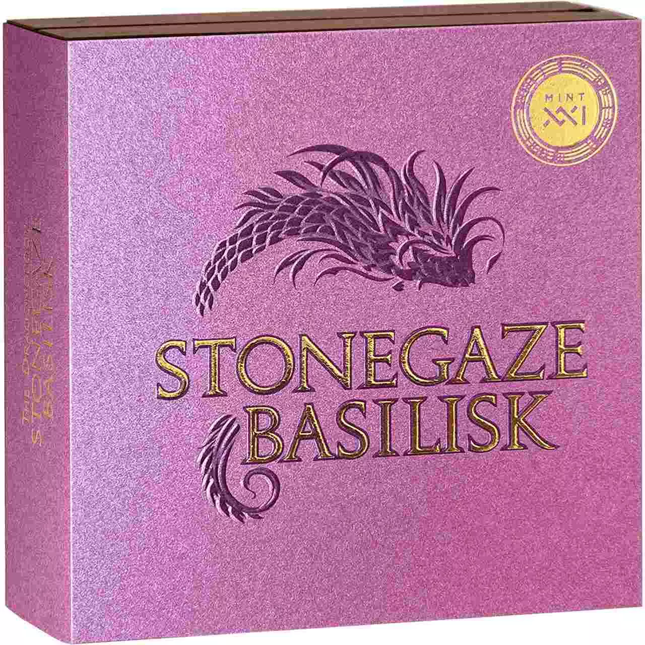 Stonegaze Basilisk zawiera dwie uncje srebrna najwyższej próby, co umożliwia zachowanie imponujących detali projektu, jednocześnie czyniąc monetę przystępną cenowo. Ponadto walor posiada kolorowy nadruk. Wyjątkowa precyzja i szczegółowość projektu w połączeniu z wysokim reliefem sprawia, że moneta stanowi prawdziwe dzieło sztuki.