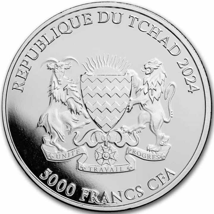 Awers przedstawia herb Republiki Czadu.
