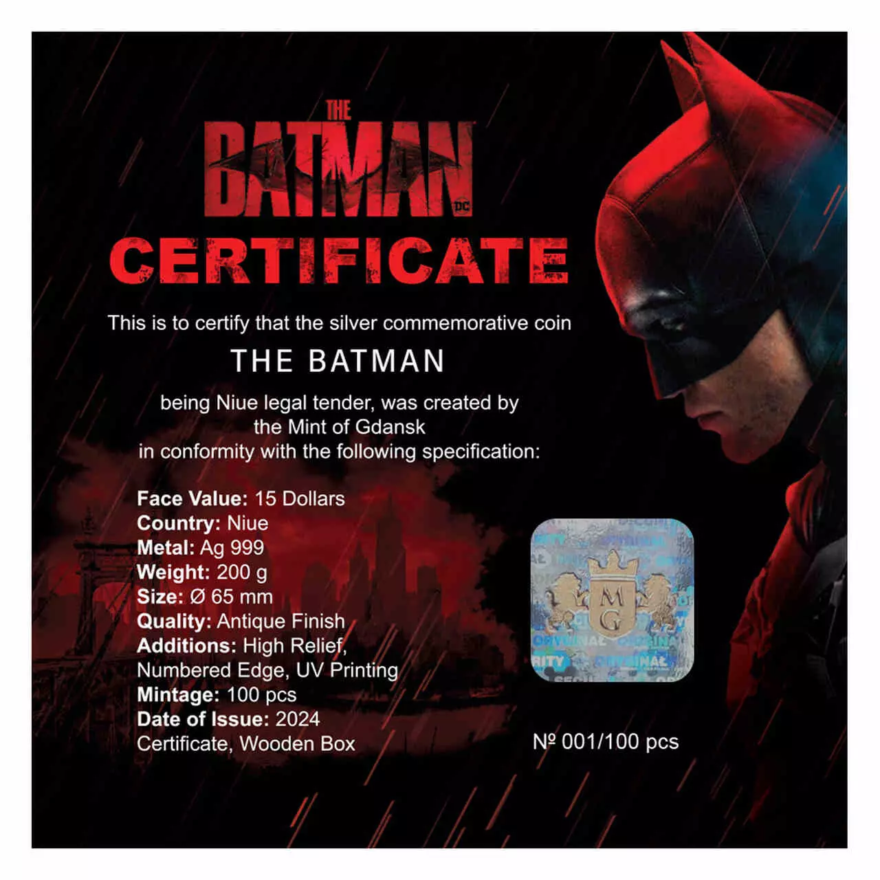 The Dark Knight został wybity ze srebra najwyższej próby w jakości ultra high relief. Walor o wadze 200 gram posiada antyczne wykończenie, kolorowy nadruk oraz numerowany rant.