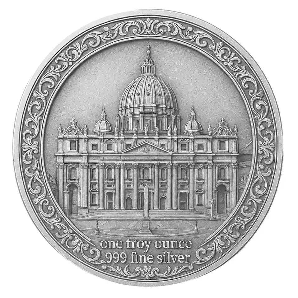 Rewers monety ukazuje majestatyczną fasadę Bazyliki św. Piotra na Watykanie, otoczoną eleganckim ornamentem roślinnym. Scena ta przywołuje nie tylko duchowe centrum Kościoła, ale i symboliczne znaczenie papieskiego urzędu. U dołu znajduje się oznaczenie wagi i próby srebra: