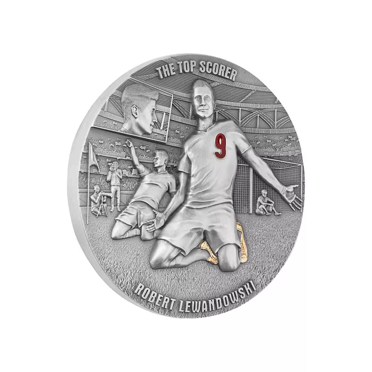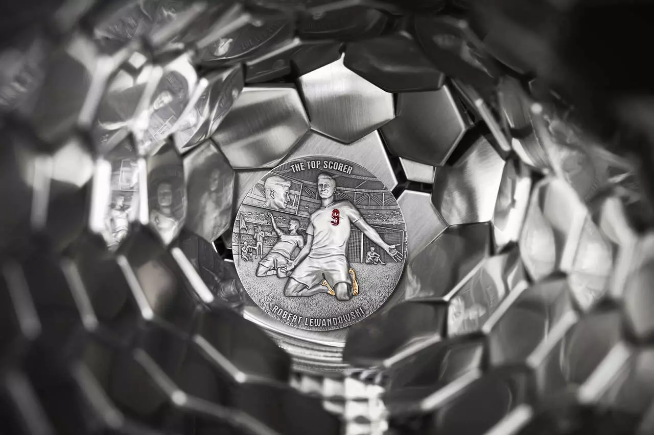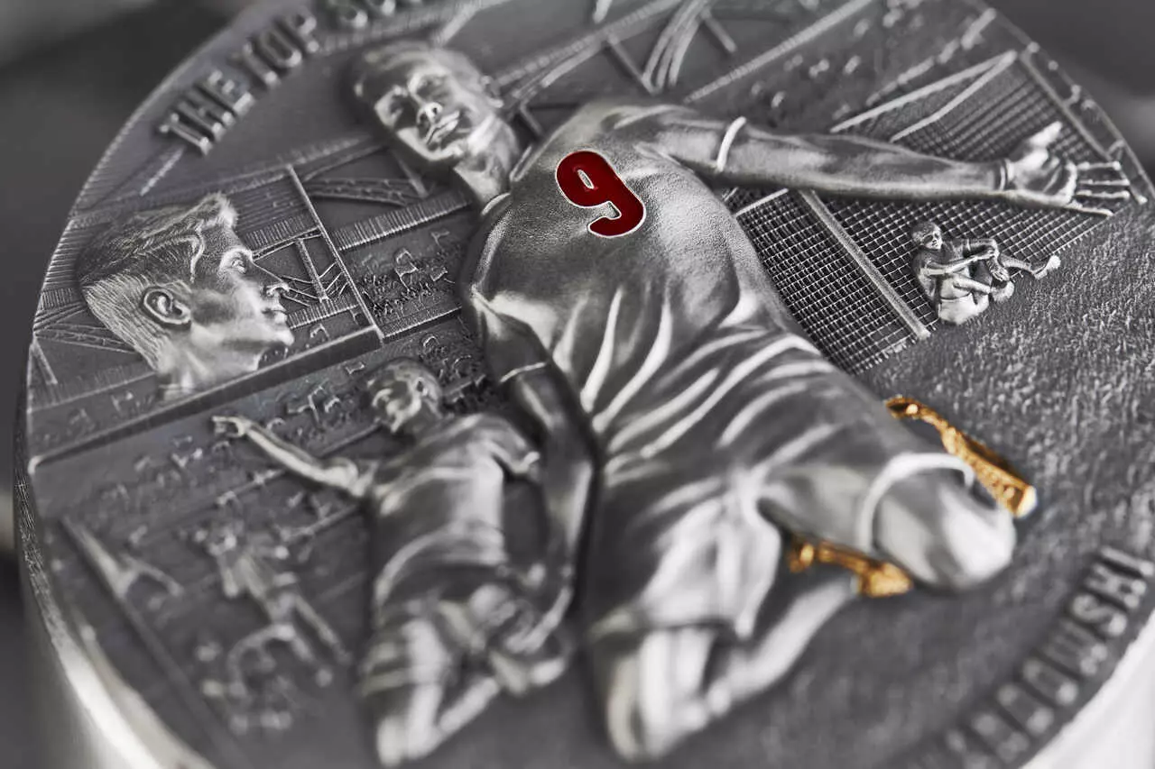 The Top Scorer zawiera dwie uncje czystego srebra najwyższej próby. Moneta wybita w jakości ultra high relief została poddana zabiegowi oksydacji oraz wzbogacona o selektywne złocenie i żywicę.
