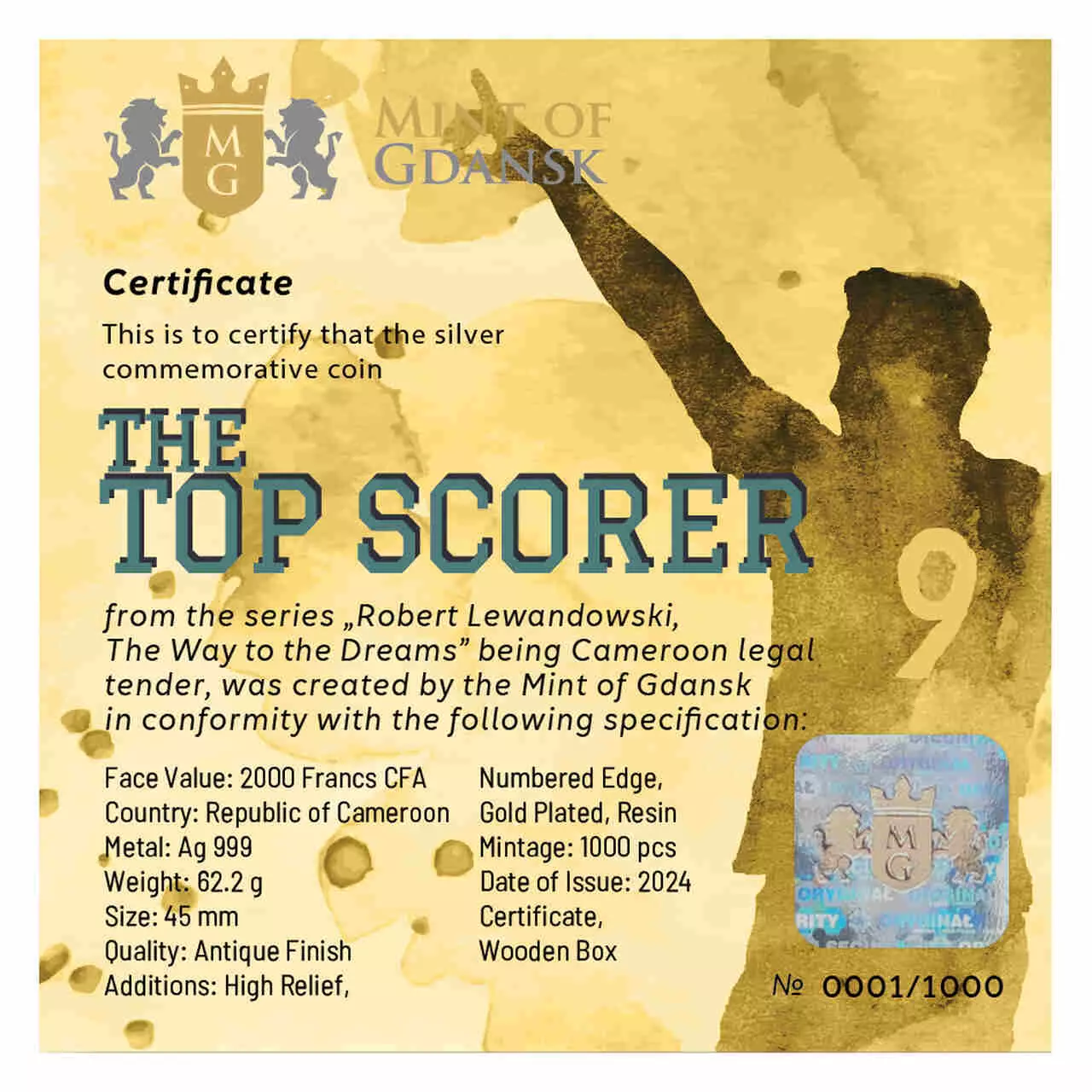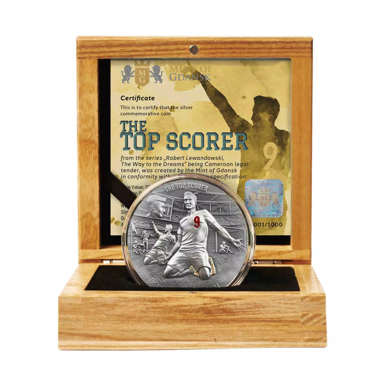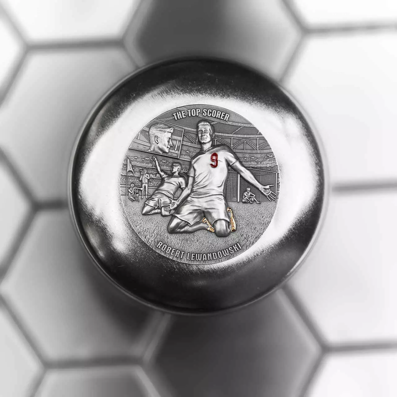 The Top Scorer zawiera dwie uncje czystego srebra najwyższej próby. Moneta wybita w jakości ultra high relief została poddana zabiegowi oksydacji oraz wzbogacona o selektywne złocenie i żywicę.