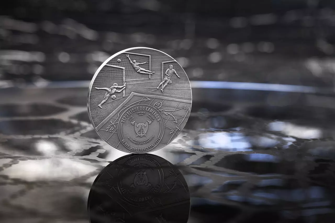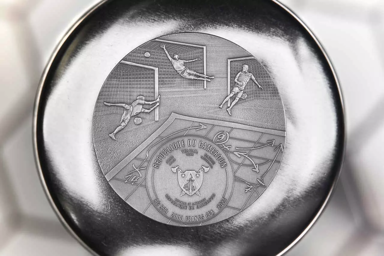 Awers ukazuje herb Republiki Kamerunu na tle bramkarzy w akcji oraz schematu taktycznego gry.
