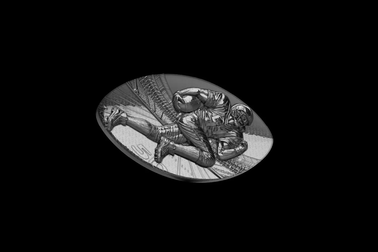 Touch Down przedstawia wizerunek zawodnika biegnącego po murawie z piłką pod pachą, odsłaniając jego siłę, umiejętności i determinację. Jego sylwetka z wyraźnie zaznaczonymi mięśniami podkreśla realistyczny i sportowy charakter monety.