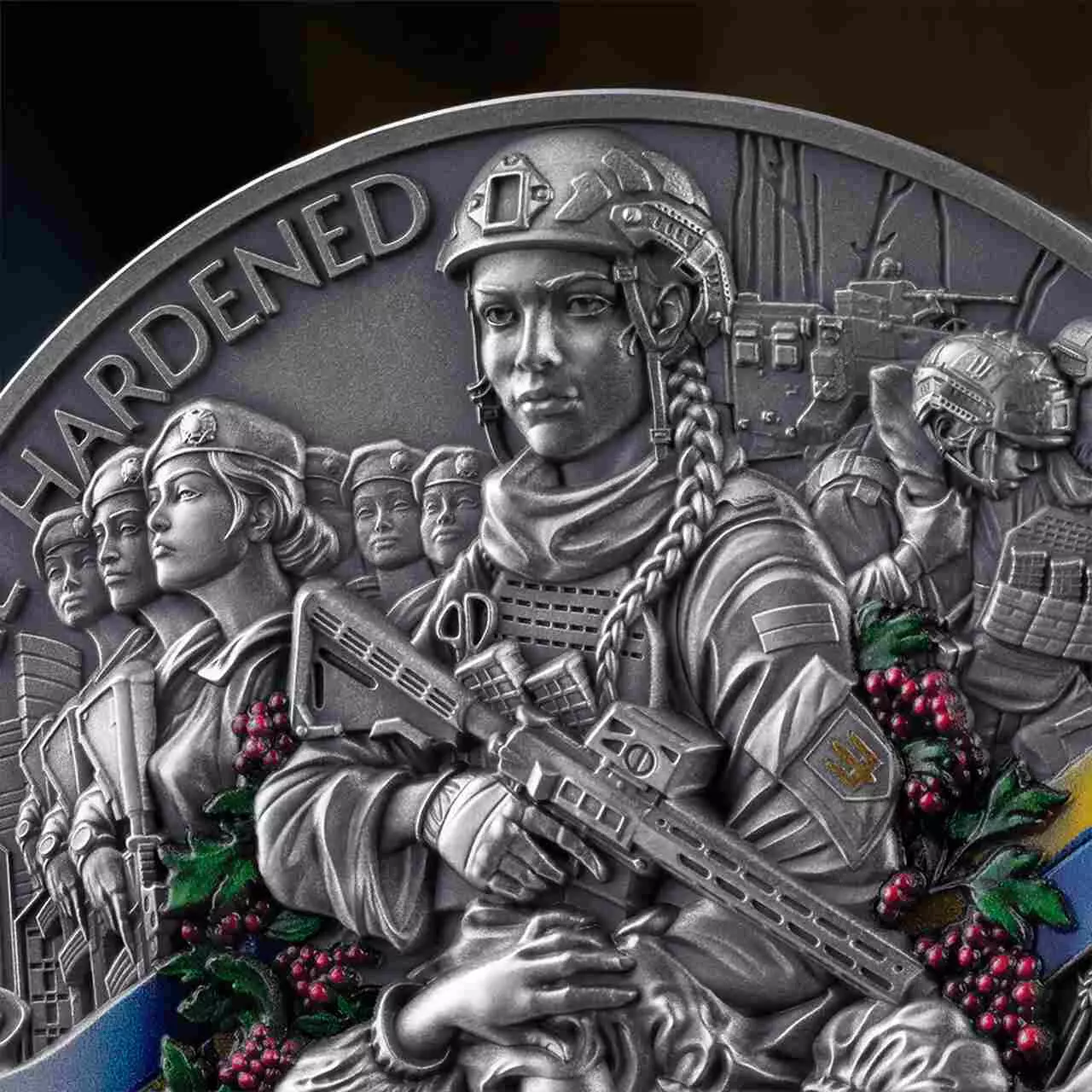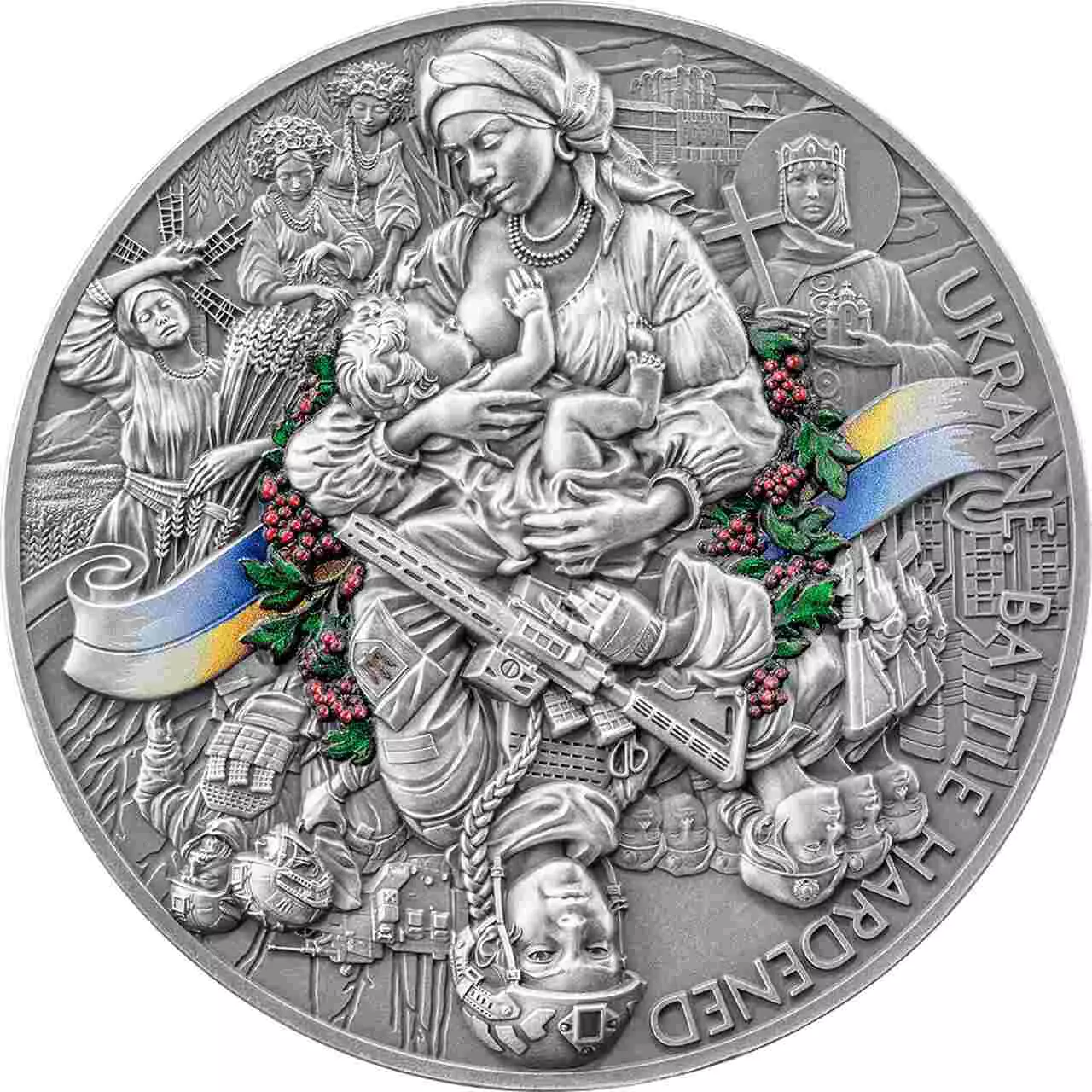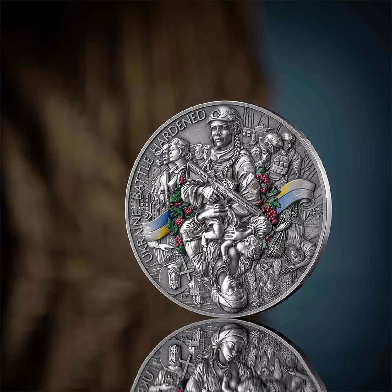Ukraine Battle Hardened 2.0 to srebrny walor kolekcjonerski oddający hołd Ukraińcom, którzy walczyli o demokrację i wolność. Ukraine Battle Hardened 2.0 to kontynuacja monety, odzwierciedlającej odporność ludzi, którzy przez wieki strzegli swojej wolności i pokoju. U jego podstaw leży podwójna istota kobiecości. Obok symbolicznego wizerunku ukraińskiej kobiety z przeszłości moneta przedstawia wizerunki współczesnych kobiet, które u boku mężczyzn stają jako snajperki, sanitariuszki i jednostki artylerii, uosabiając nową erę nowoczesnej wojny. Są wojownikami z konieczności, ale ich istota pozostaje zakorzeniona w dążeniu do wolności i pokoju.