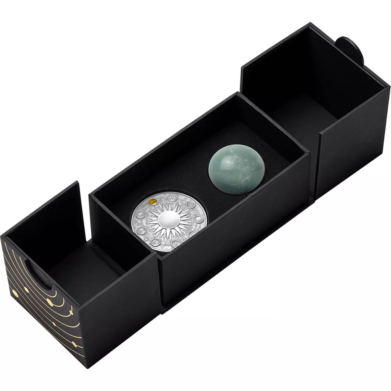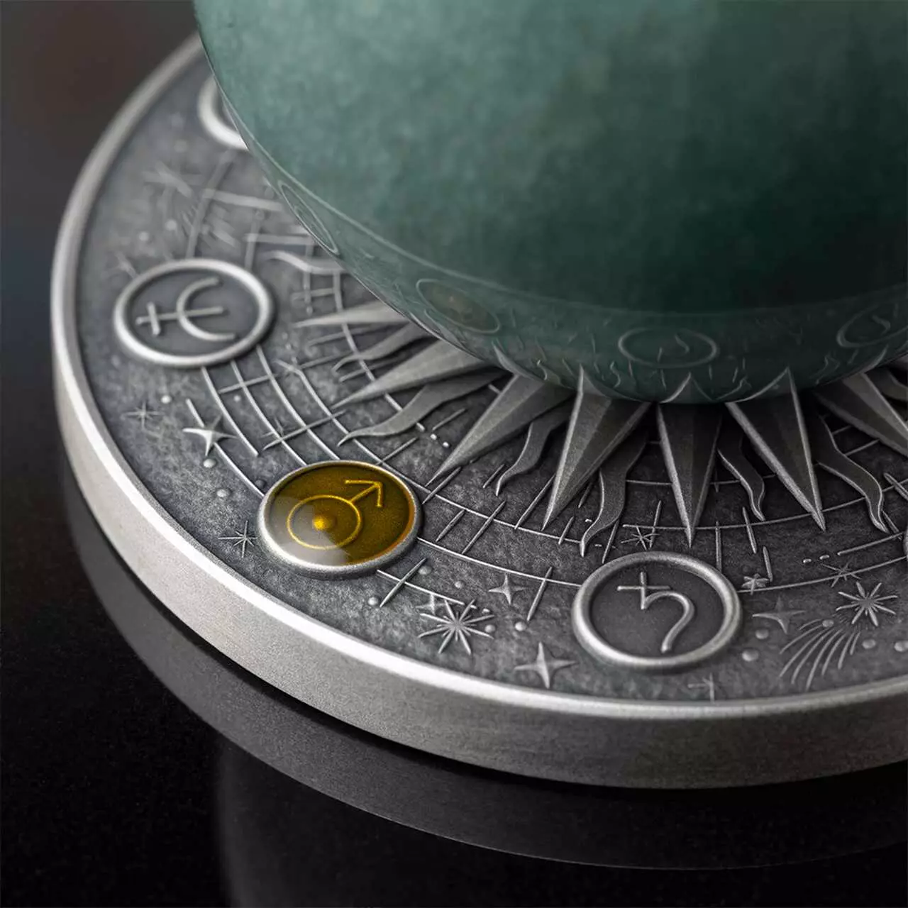 Symbolika i detale artystyczne: Realistyczne odwzorowanie Urana w otoczeniu mglistych pierścieni i minimalistycznych księżyców ukazuje tajemniczość tej planety. Precyzyjne detale oddają spokojne piękno tej gazowej planety, co nadaje monecie wyjątkowego charakteru.