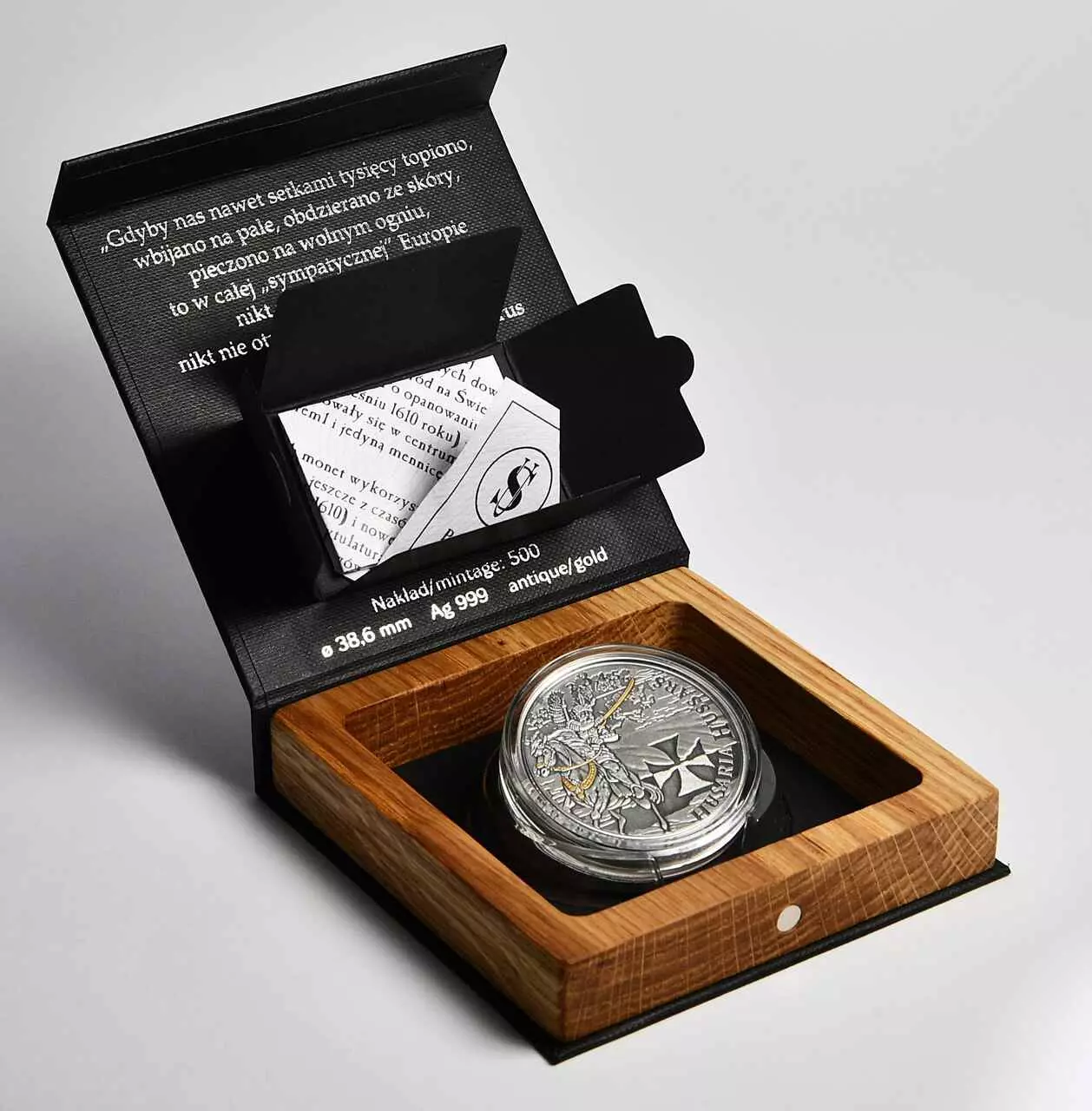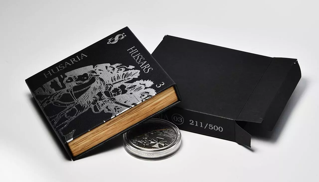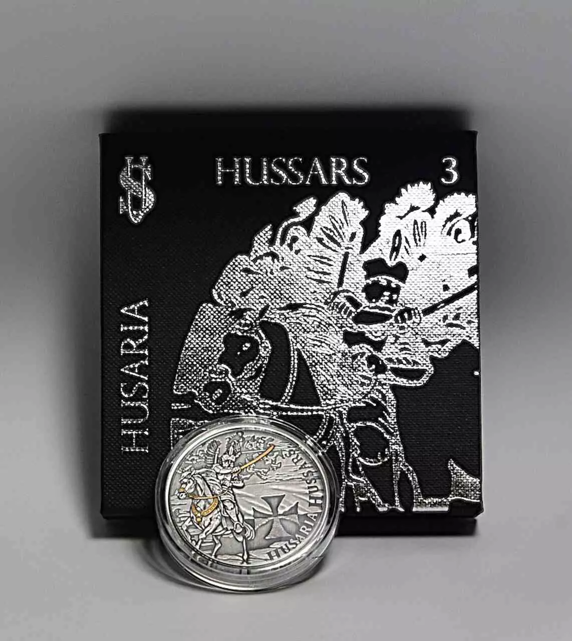 Husaria 3 to srebrny medal próby 999 o wadze jednej uncji. Walor posiada antyczne wykończenie oraz został selektywnie pozłocony 24- karatowym złotem.