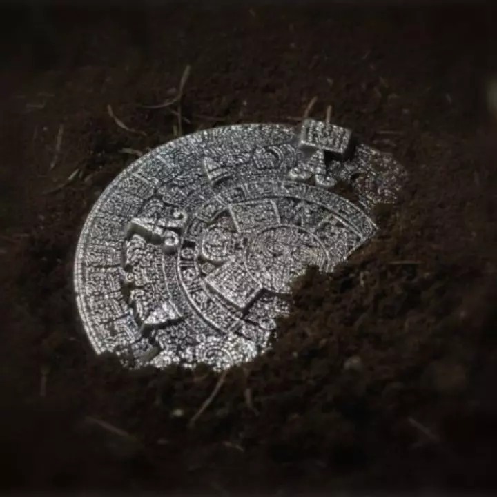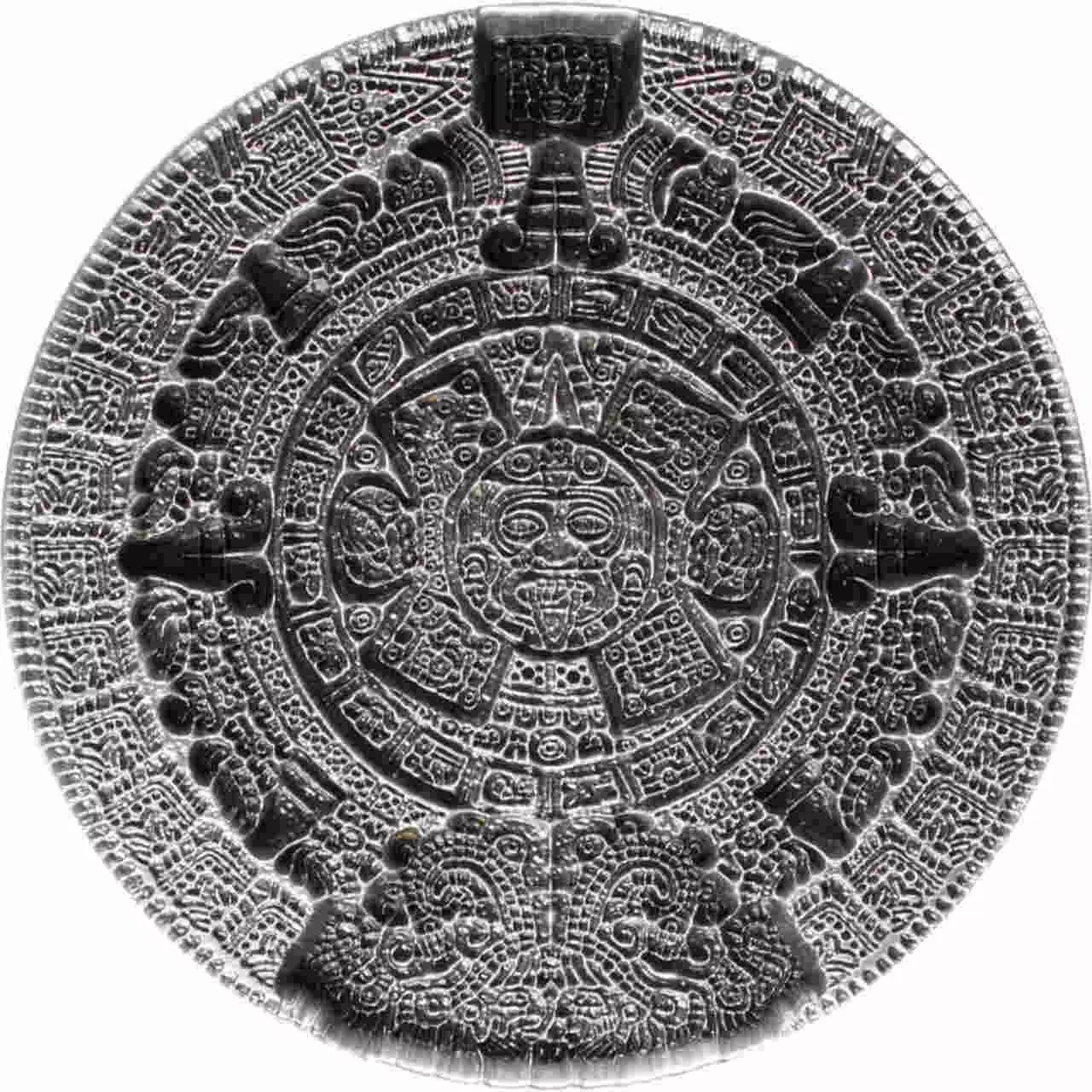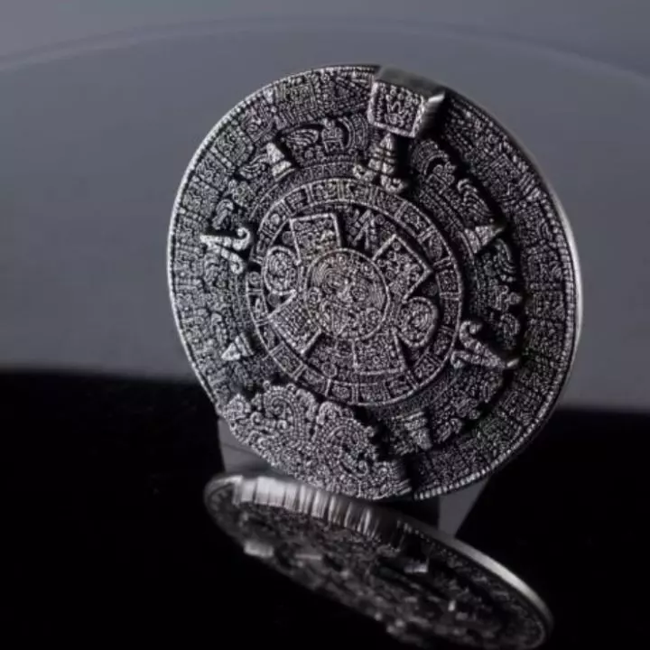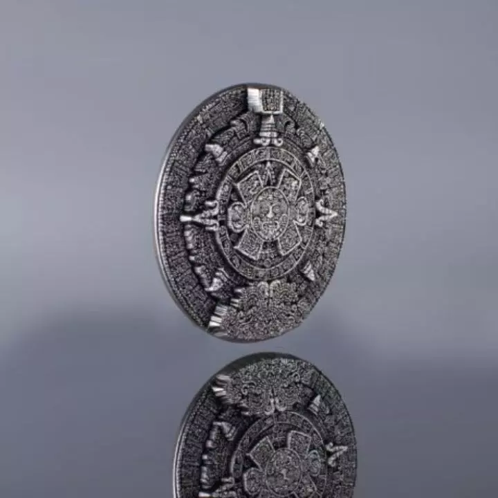 Awers ukazuje wklęsły aztecki kamień słoneczny.