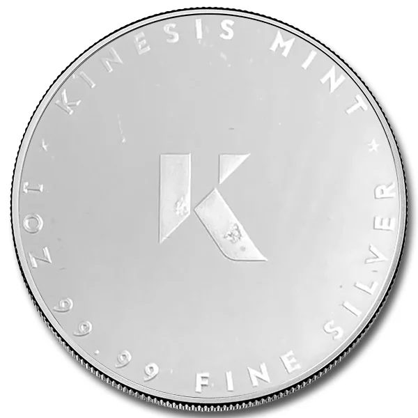 Awers ukazuje charakterystyczne „K” Kinesis otaczające monetę w stylu bezpiecznego skarbca metali szlachetnych, odzwierciedlające wewnętrzną wartość i bezpieczeństwo posiadania fizycznych metali szlachetnych.