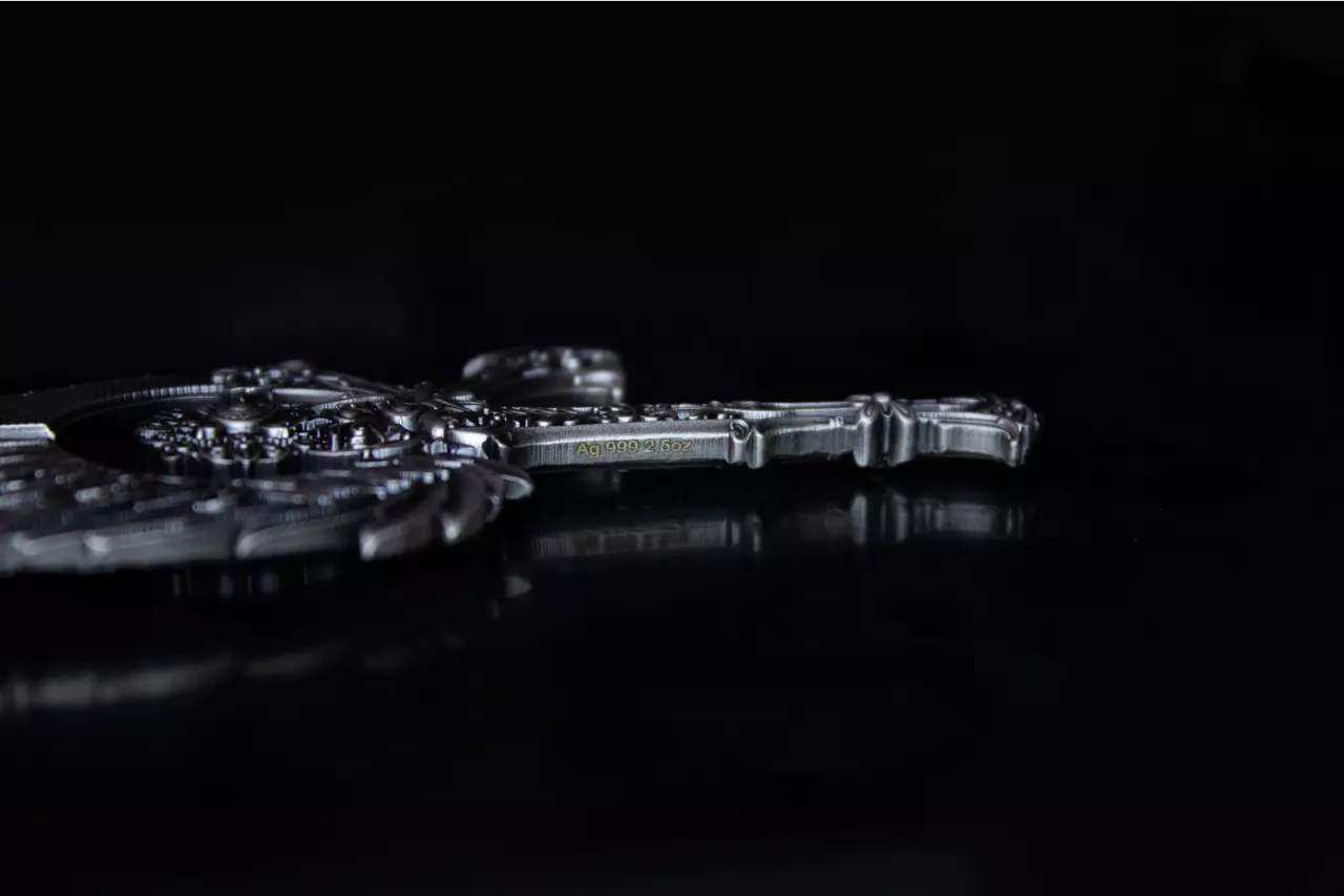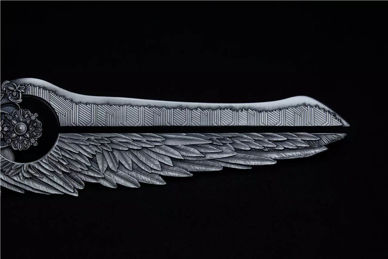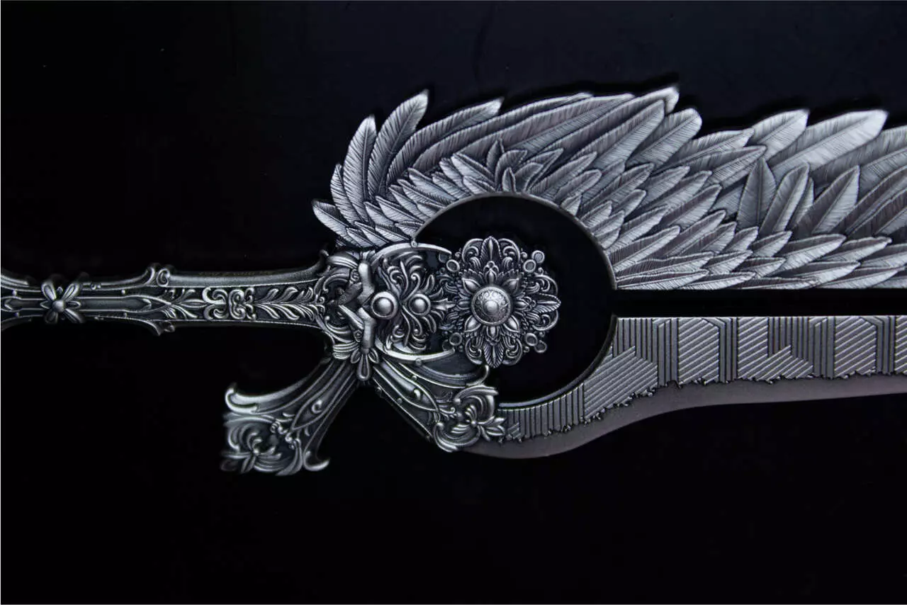 Sword of St.Uriel zawiera 2.5 uncji srebra najwyższej próby. Numizmat w kształcie miecza charakteryzujący się oszałamiającym kunsztem i potężnym designem.
