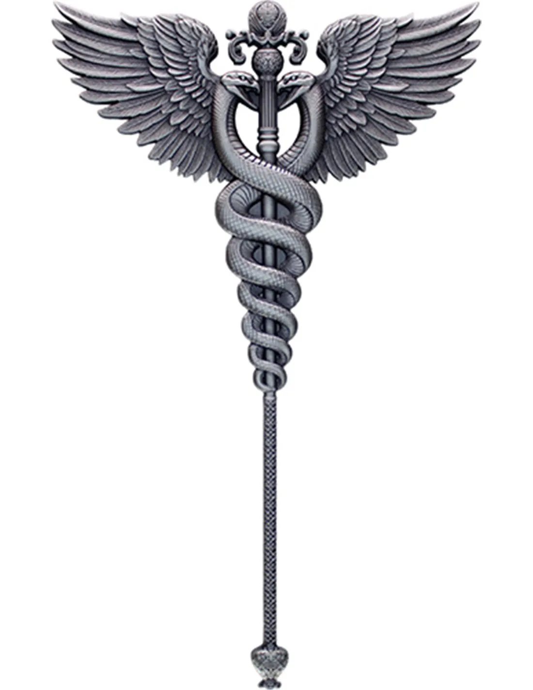 Winged Staff to numizmat wybity z 2,5 uncji srebra próby 999 w kształcie berła, wokół którego owijają się dwa węże. Numizmat został zaprojektowany z niezwykłą dbałością o detale i artystyczną kompozycję oraz uszlachetniony przy pomocy selektywnego złocenia, co nadaje mu ekskluzywnego charakteru i podkreśla jego unikalny design. Finezyjne zdobienia, złocone detale i dynamiczna kompozycja nadają numizmatowi efektowny charakter, łącząc tradycyjne rzemiosło z nowoczesnym designem.