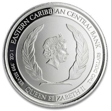 Wąski pas otacza krawędź, na którym znajduje się napis „EASTERN CARIBBEAN CENTRAL BANK. 1 uncja .999 SREBRA. KRÓLOWA ELŻBIETA II . DWA DOLARY.”