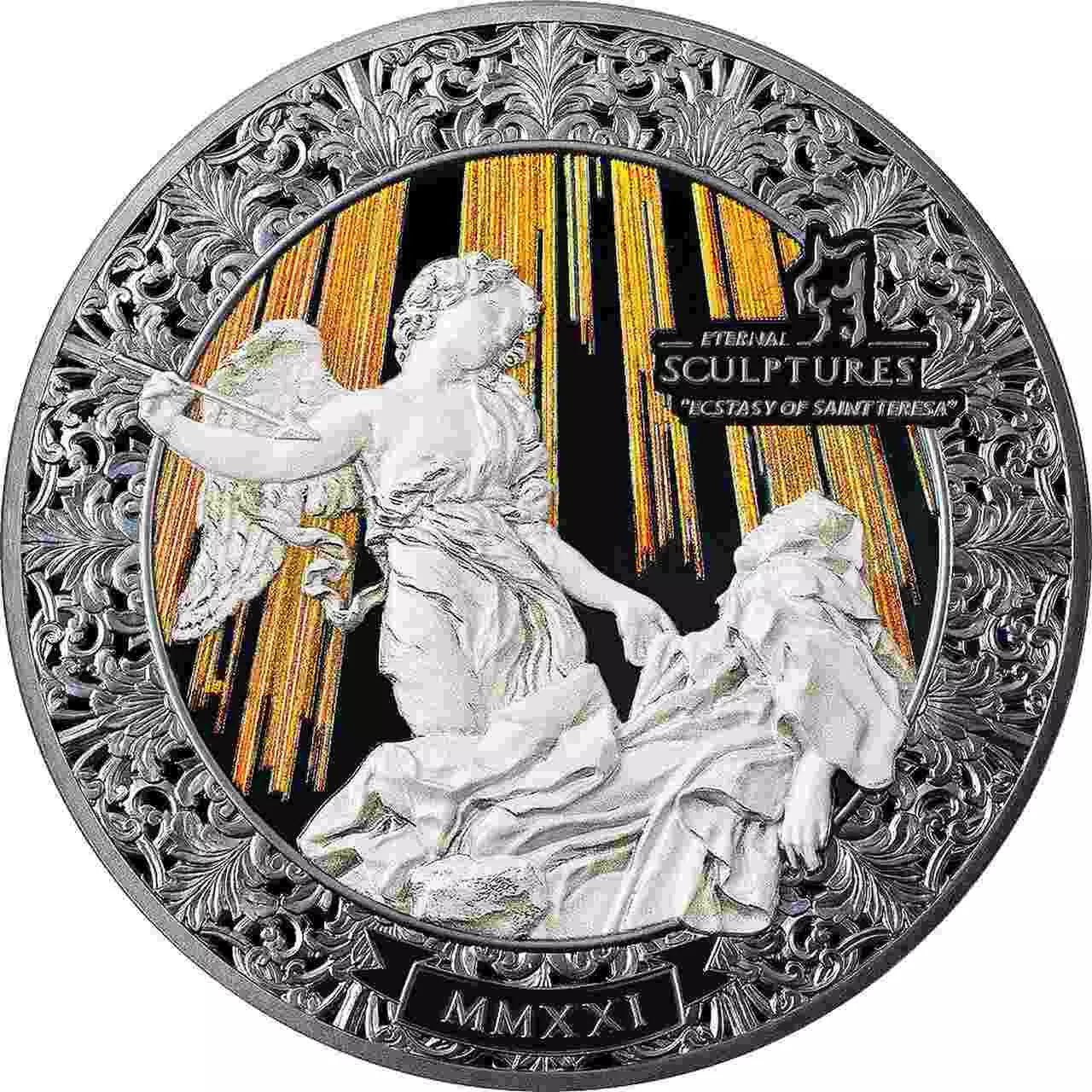 The Ecstasy of Saint Teresa to oszałamiająca srebrna moneta o pojemności 5 uncji, będąca specjalną edycją z serii Eternal Sculptures. Moneta została poświęcona słynnej Ekstazie Świętej Teresy, autorstwa Gian Lorenzo Berniniego. Dzieło to przedstawia świętą Teresę z Avili i anioła.