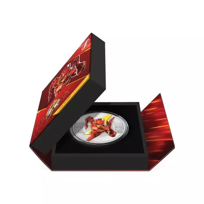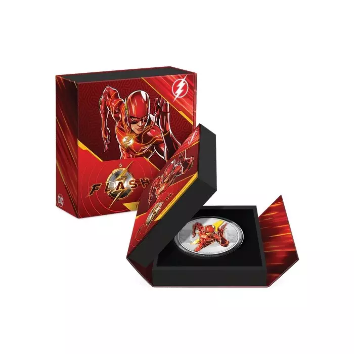 Przedstawiamy srebrną monetę kolekcjonerską wzbogaconą o kolorowy nadruk przedstawiającą bohatera universum DC- The Flash Movie. The Flash, znany jako Barry Allen, to superbohater, który w wyniku porażenia prądem uzyskał nadludzką prędkość. Dzięki czemu ma zdolność poruszania się w czasie czy przenikania przez ściany.
