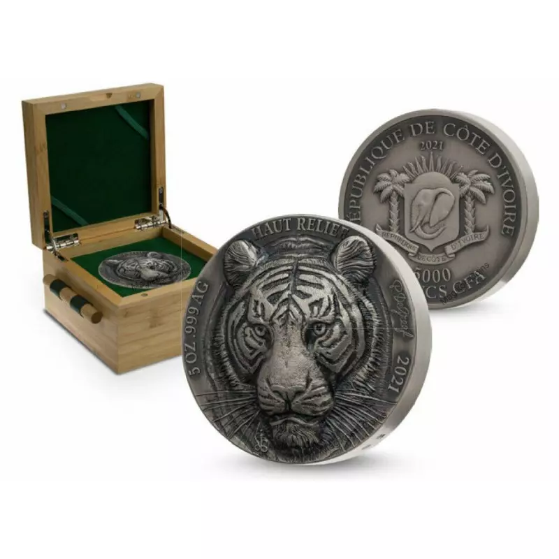 Moneta o wadze pięciu uncji została wybita ze srebra próby 999 w jakości high relief. Tygrys posiada antyczne wykończenie.