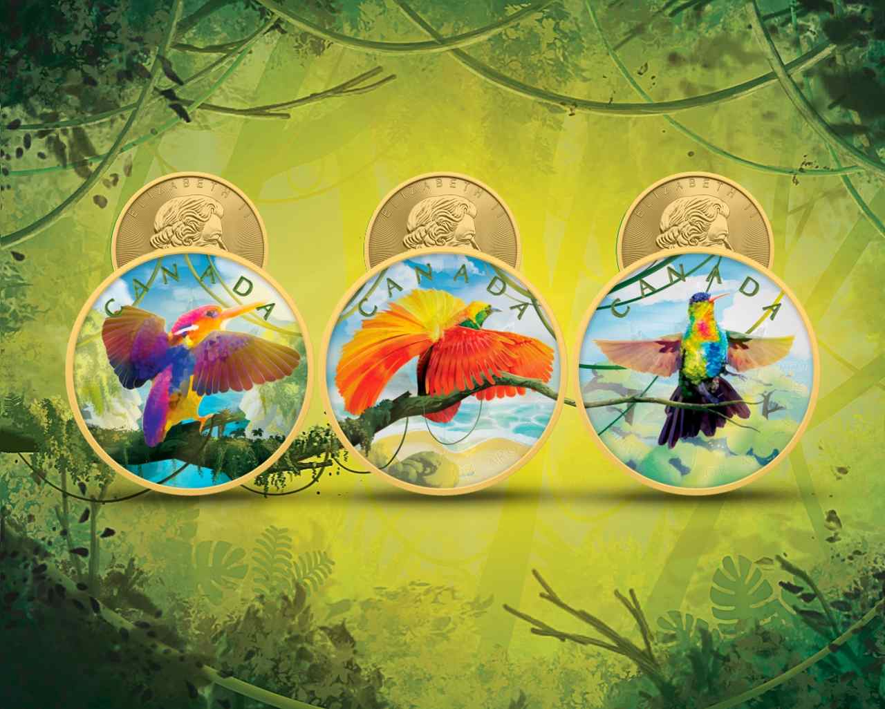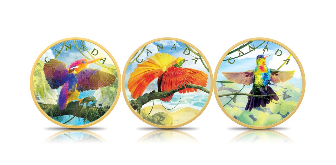 Rewersy przedstawiają kolorowe wizerunki ptaków: zimorodka orientalnego, cudowronki wielkiej oraz trzecia moneta oraz złotniczka.