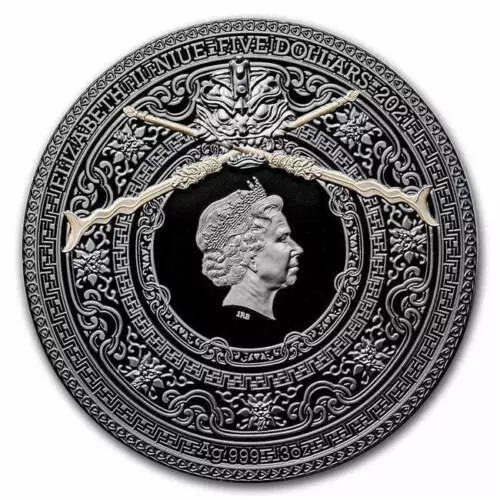 Awers zdobi wizerunek Królowej Elżbiety II otoczonej wzorami. Nad jej głową znajduje się para pozłoconych włóczni Zhang Fei.