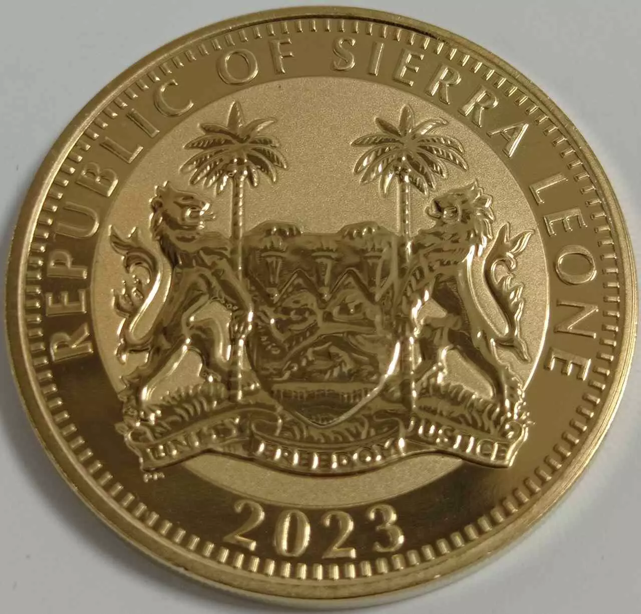 Awers monety ukazuje herb Sierra Leone.