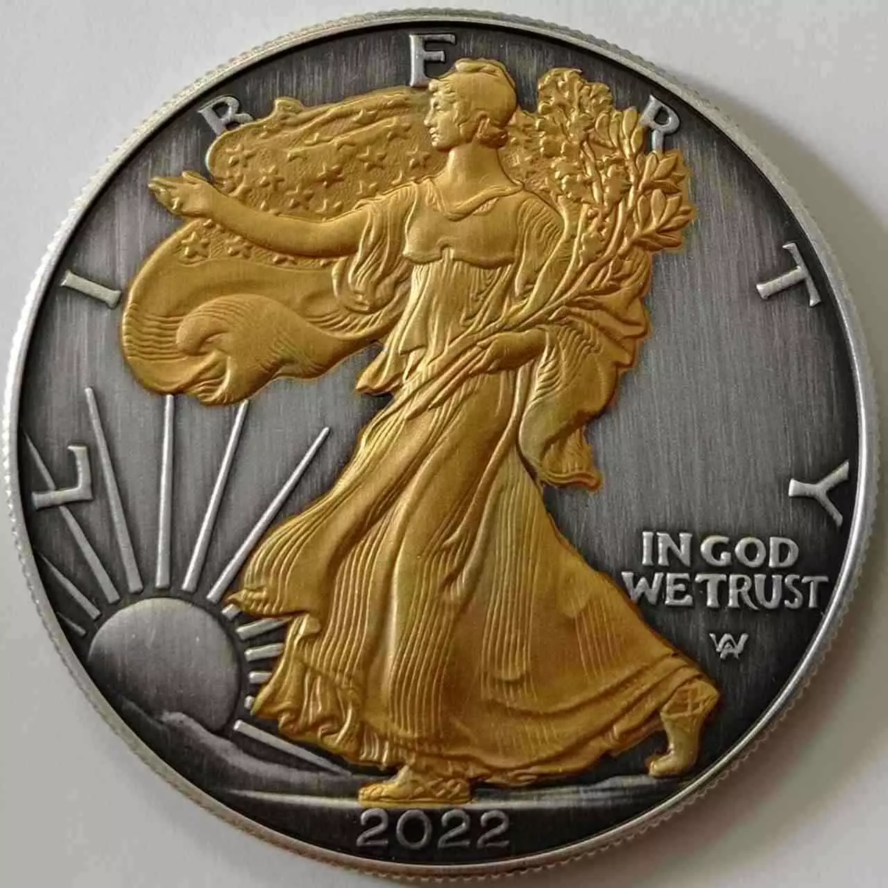 Awers przedstawia klasyczny projekt stosowany w monetach American Silver Eagle. Widzimy na nim majestatycznego orła w locie, trzymającego w szponach gałązkę oliwną i strzały — symbol siły i pokoju. Wzdłuż krawędzi umieszczono napisy „UNITED STATES OF AMERICA”, „ONE DOLLAR” oraz „1 OZ FINE SILVER”, potwierdzające wagę, czystość srebra i status monety jako oficjalnego środka płatniczego.