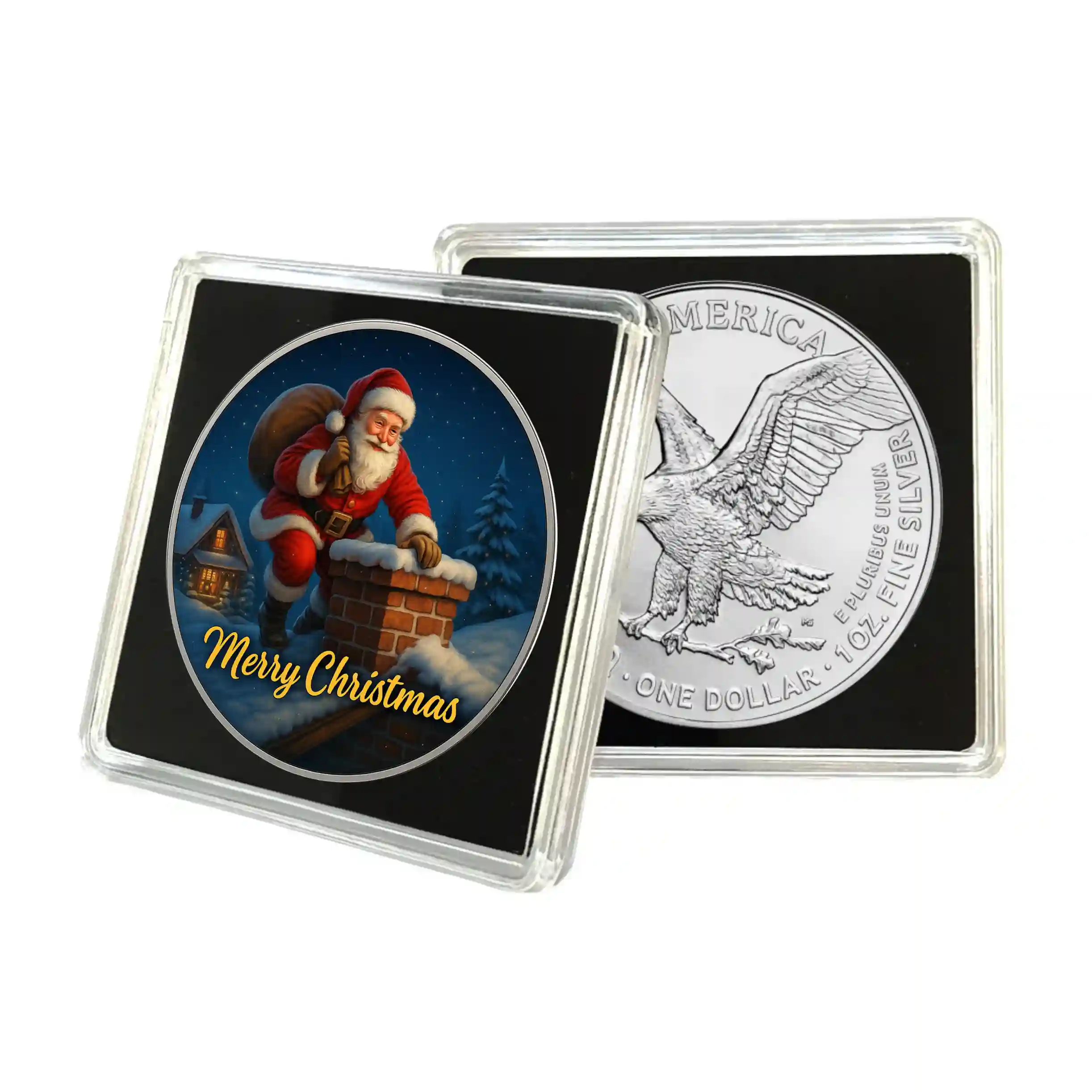 Srebrna moneta Amerykański Orzeł 1 uncja Srebra 2025 Merry Christmas: Santa to wyjątkowa, świąteczna edycja jednej z najbardziej rozpoznawalnych monet bulionowych świata. Limitowany, barwny rewers z przedstawieniem Świętego Mikołaja tuż przed wejściem do komina. To idealny wybór dla osób, które chcą połączyć inwestycję w czyste srebro z magiczną atmosferą Bożego Narodzenia — zarówno jako prezent, jak i element kolekcji tematycznej.