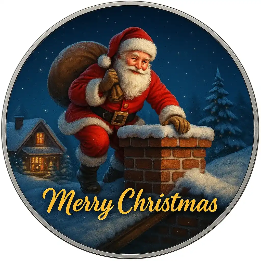Rewers monety zdobi kolorowa, świąteczna ilustracja przedstawiająca Świętego Mikołaja wspinającego się na pokryty śniegiem komin, niosącego worek pełen prezentów. Scena rozgrywa się na tle nocnego, zimowego pejzażu z ośnieżonym domem i migoczącymi gwiazdami. Dolną część kompozycji zdobi napis „Merry Christmas”, który podkreśla bożonarodzeniowy charakter edycji.