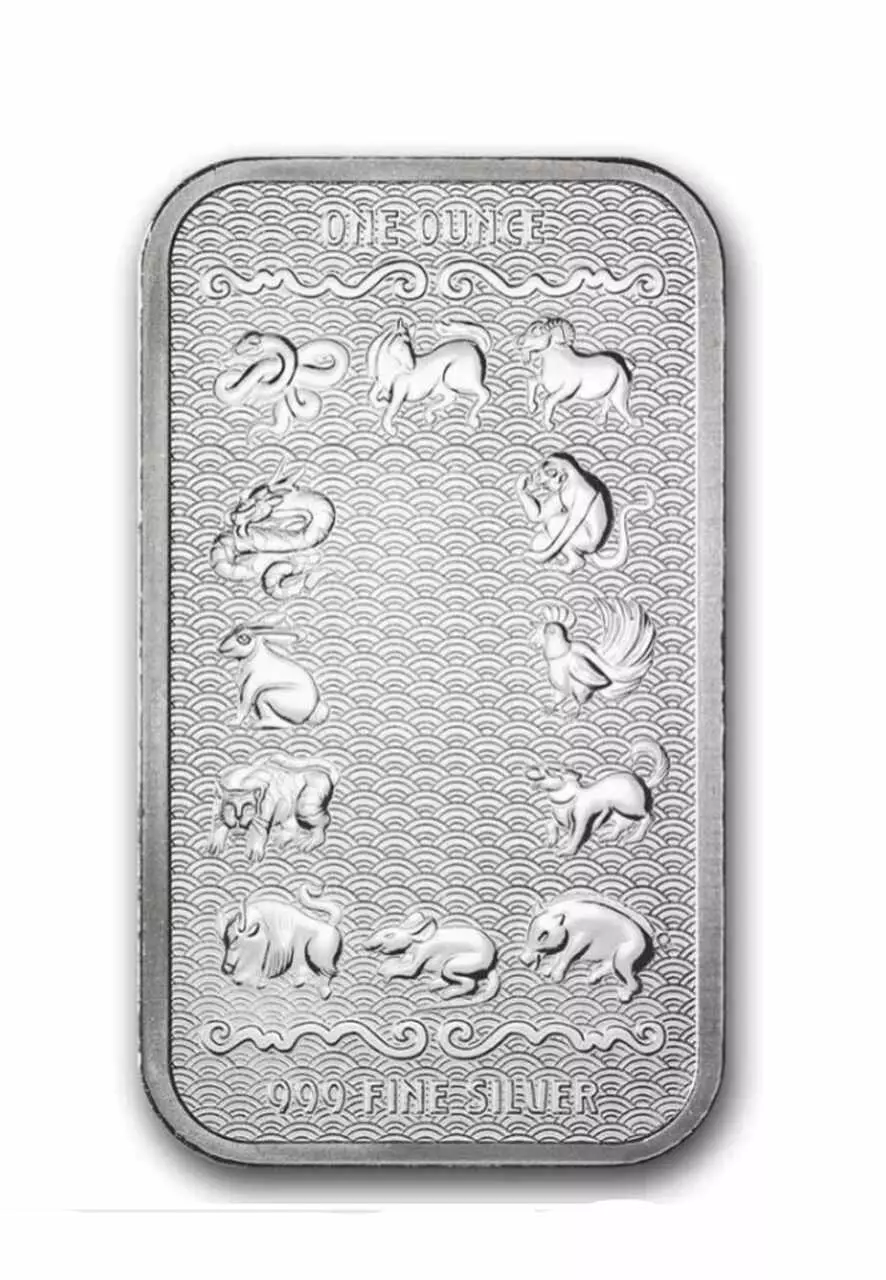Awers ukazuje wizerunki zwierząt wchodzących w skład chińskiego kalendarza lunarnego oraz informację o wadze i czystości srebra.