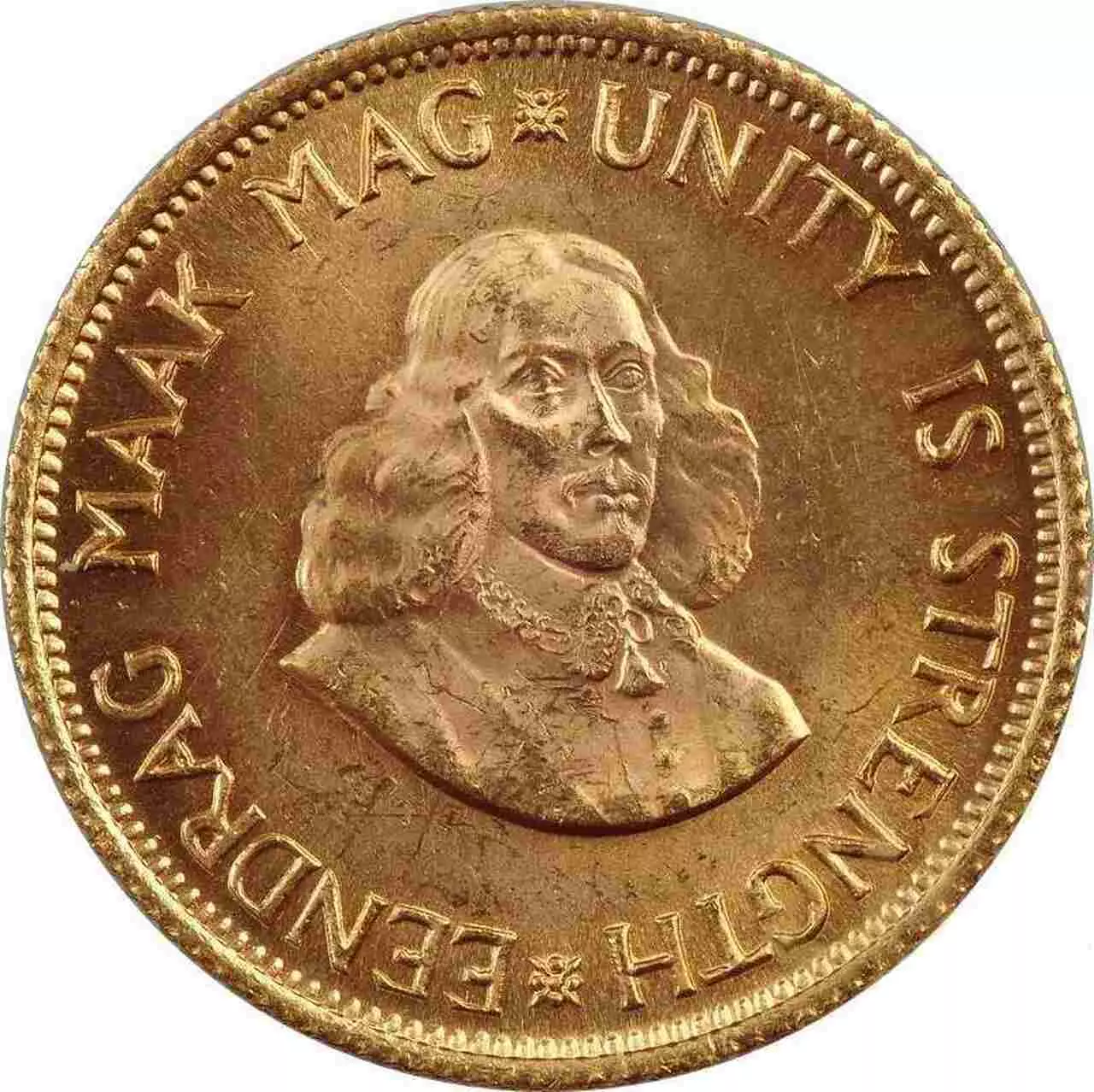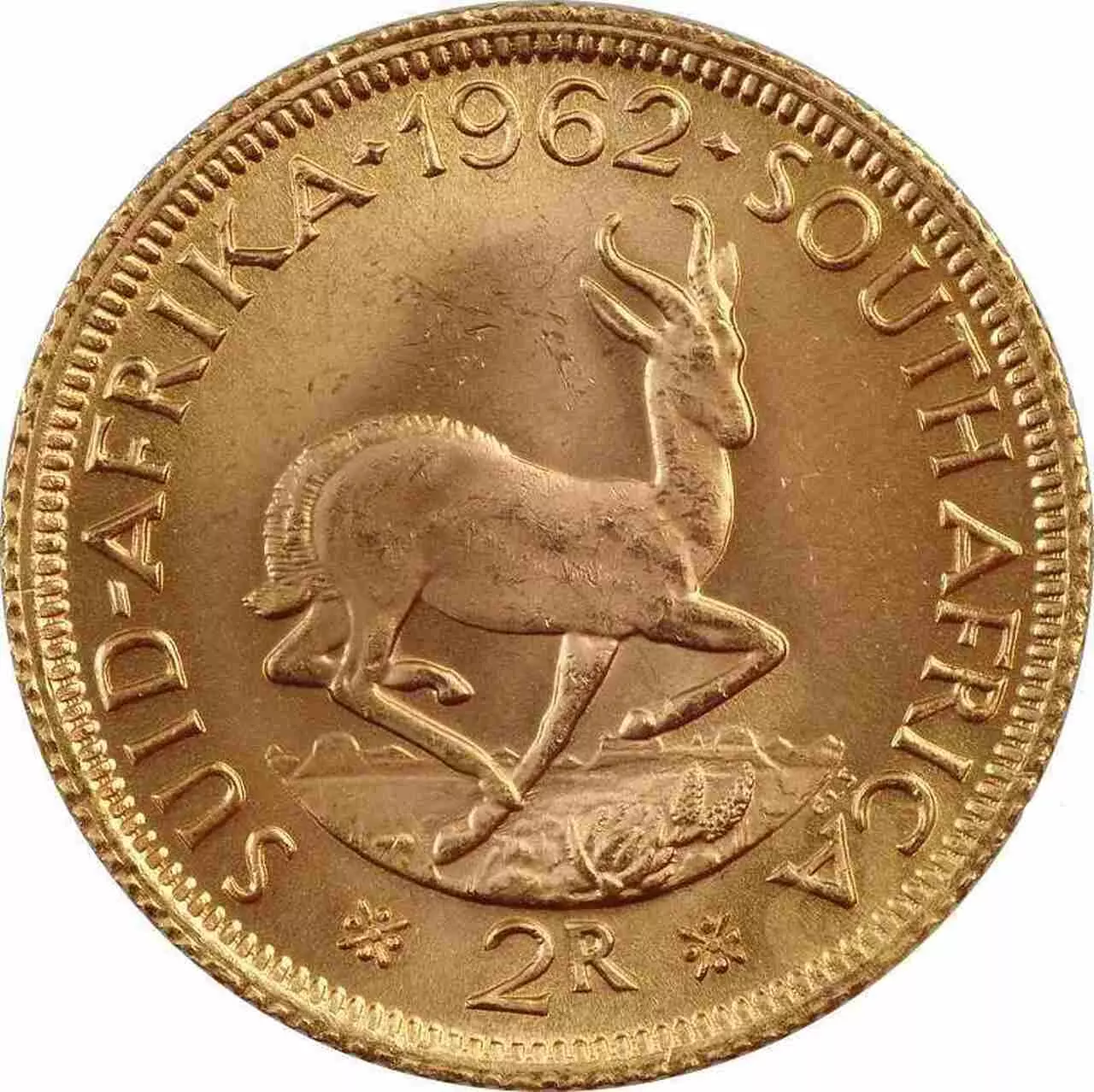 2 Rand Südafrika swoją wagą nawiązuje do angielskiej złotej monety 1 Sovereign. Moneta waży 7.98 i została wybita ze złota próby 916.