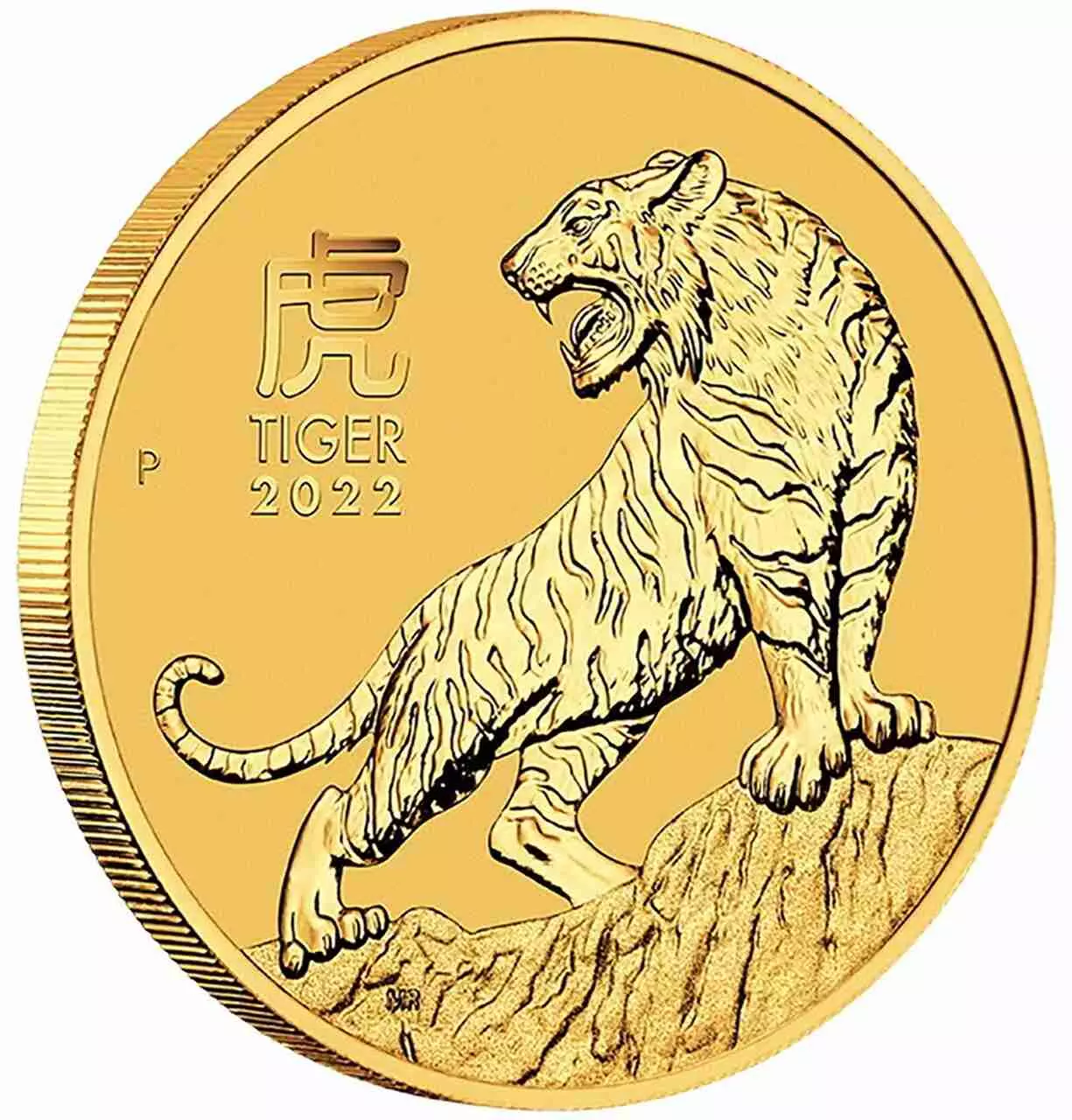 Rewers ukazuje majestatycznego tygrysa stojącego na skale, który podkreśla swoją moc poprzez ryk. Po lewej stronie tygrysa widnieje znak P dla Perth Mint, a także słowo tygrys w chińskich znakach, oraz TIGER i rok 2022. Postać tygrysa jest wyeksponowana z ogromną precyzją, a detale takie jak futro, oczy i ruch zostały odwzorowane z ogromną dbałością