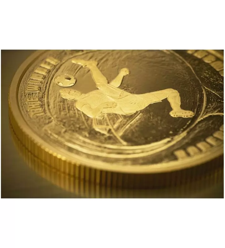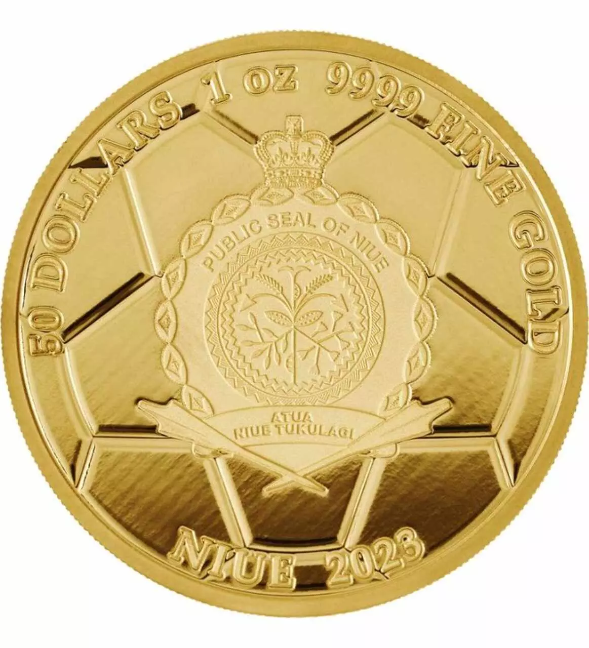 Awers zdobi herb Niue wybity na zarysie piłki nożnej.